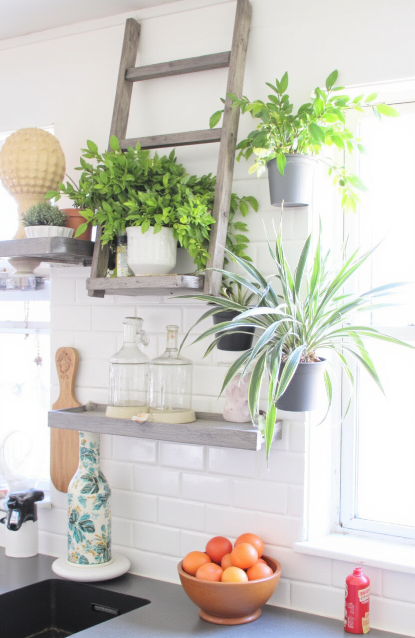 Choose succulents or trailing plants for a cascading effect. This setup is perfect for kitchens with limited counter space. Plus, it’s a great way to reuse an old ladder, making it a sustainable choice.