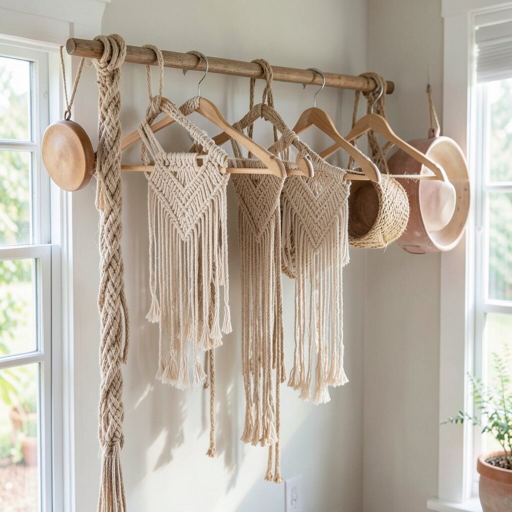These hangers are lightweight and versatile. They add texture and softness to your kitchen. Perfect for hanging herbs or lightweight pots.