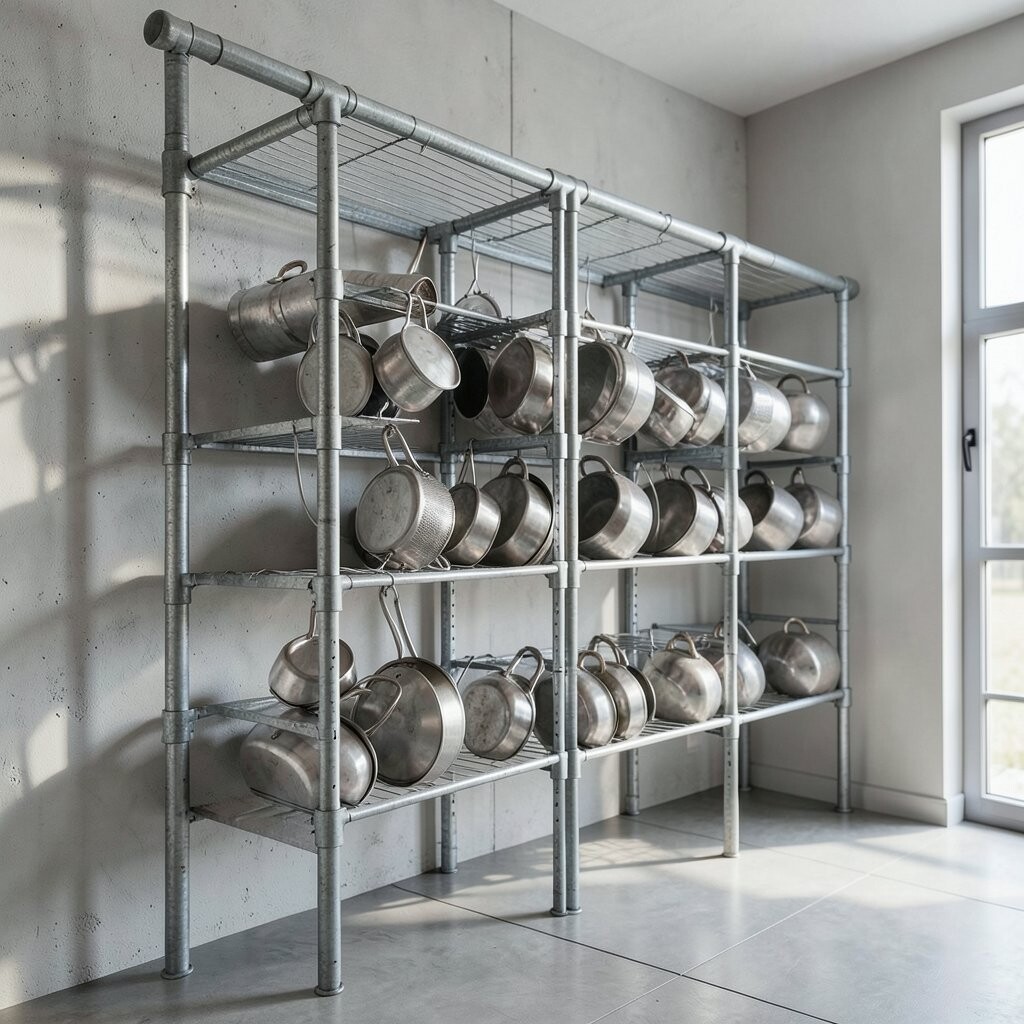 Imagine pipes used in a creative way. Industrial pipe racks give your kitchen an edgy, modern look. They’re perfect for those who love a bit of urban flair.