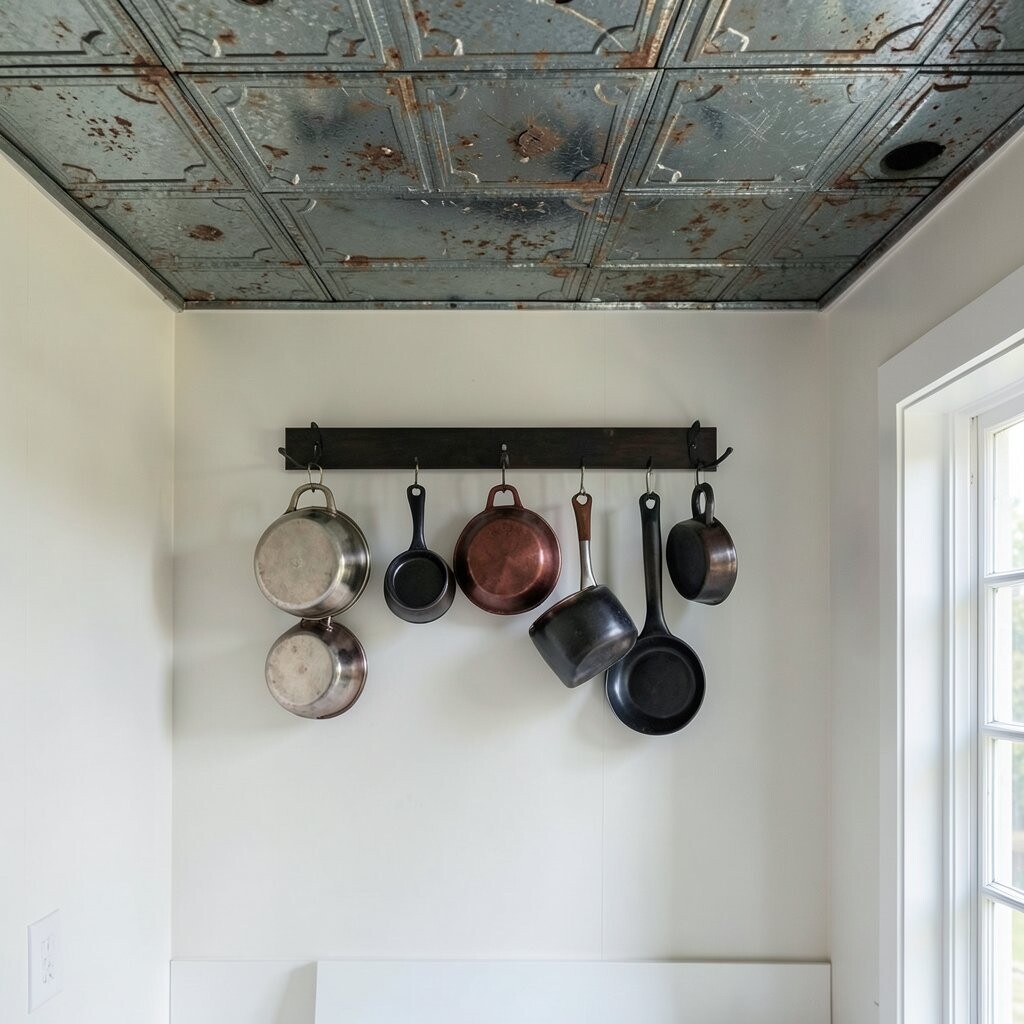 Tin ceiling tiles add a touch of history and charm. Perfect for vintage or classic kitchens. Beautifully detailed and crafted.