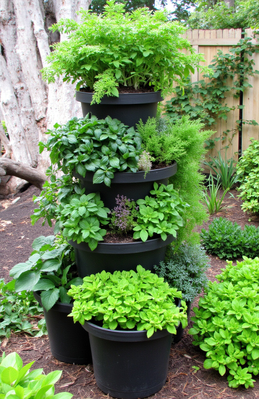 Build a tower garden with stacked pots. It saves space and adds vertical interest.