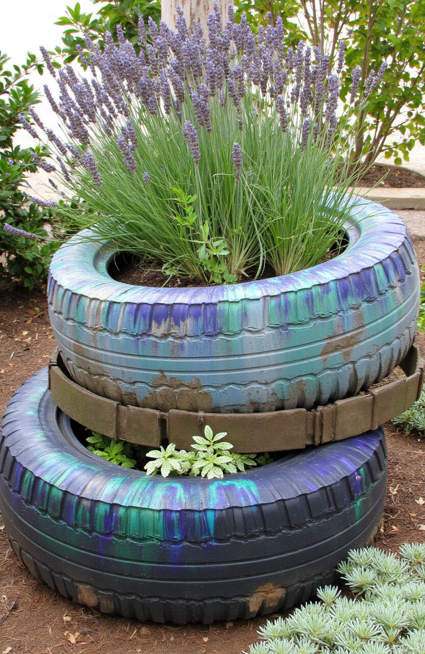 Paint old tires and stack them as planters. It’s an eco-friendly and colorful idea.