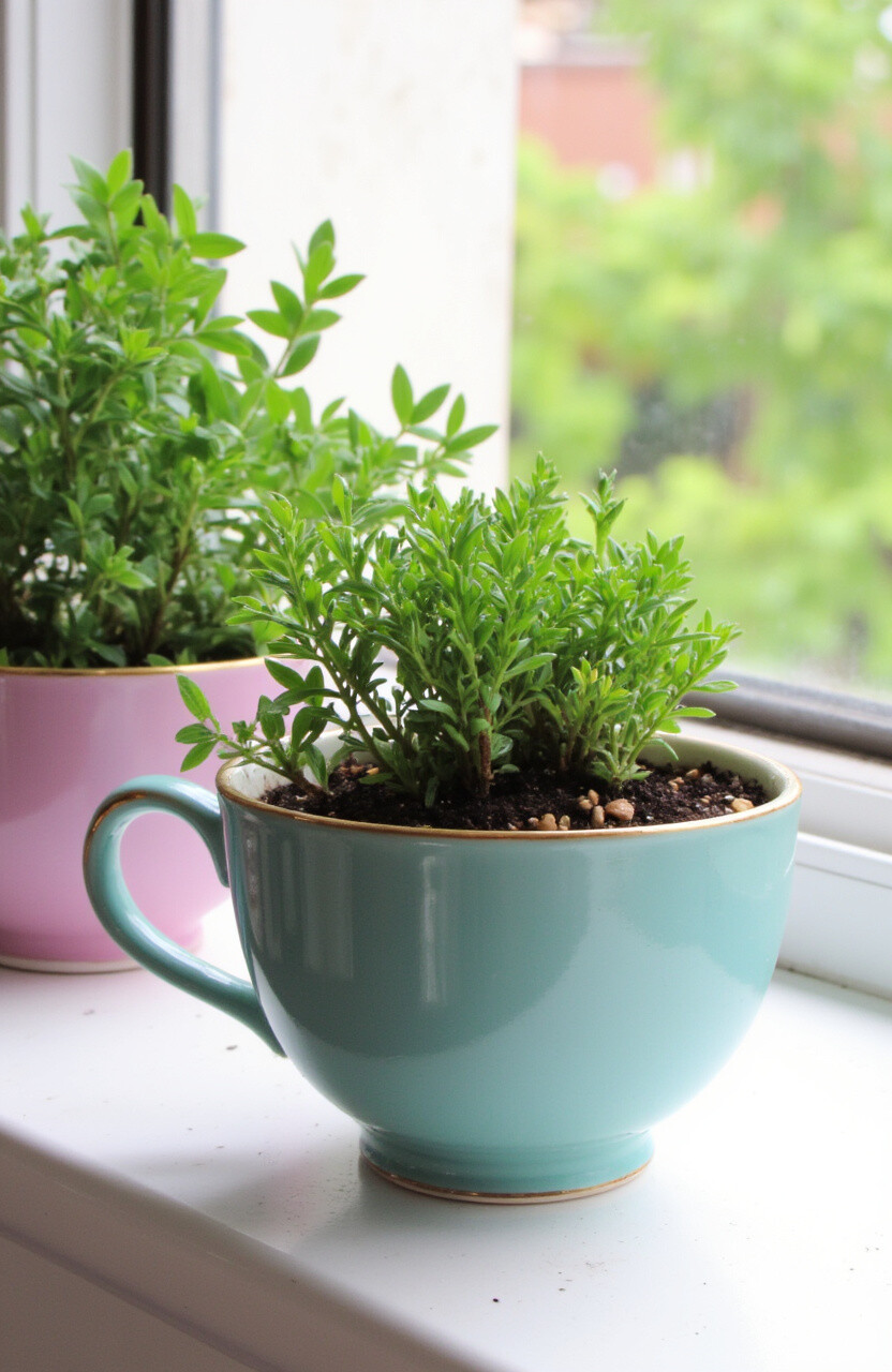 Use old teacups for a whimsical herb garden. They’re perfect for small herbs like thyme and chives.