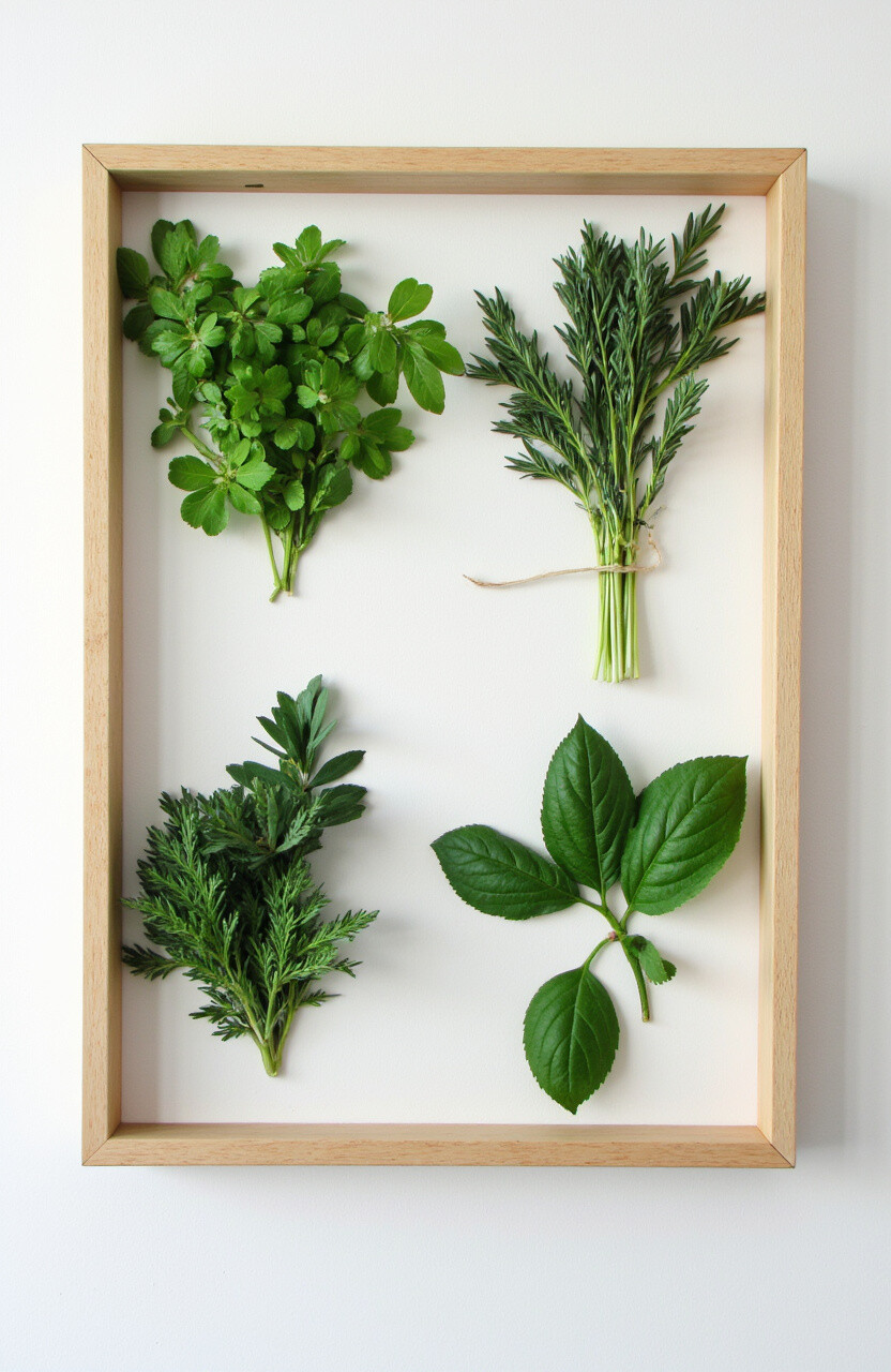 Frame herbs to create living wall art. Use shadow boxes or frames for a modern display.