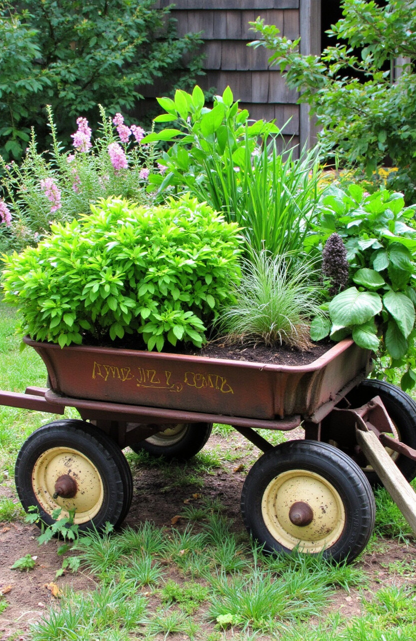 Use a vintage wagon as a mobile herb garden. It’s a charming and rustic idea.