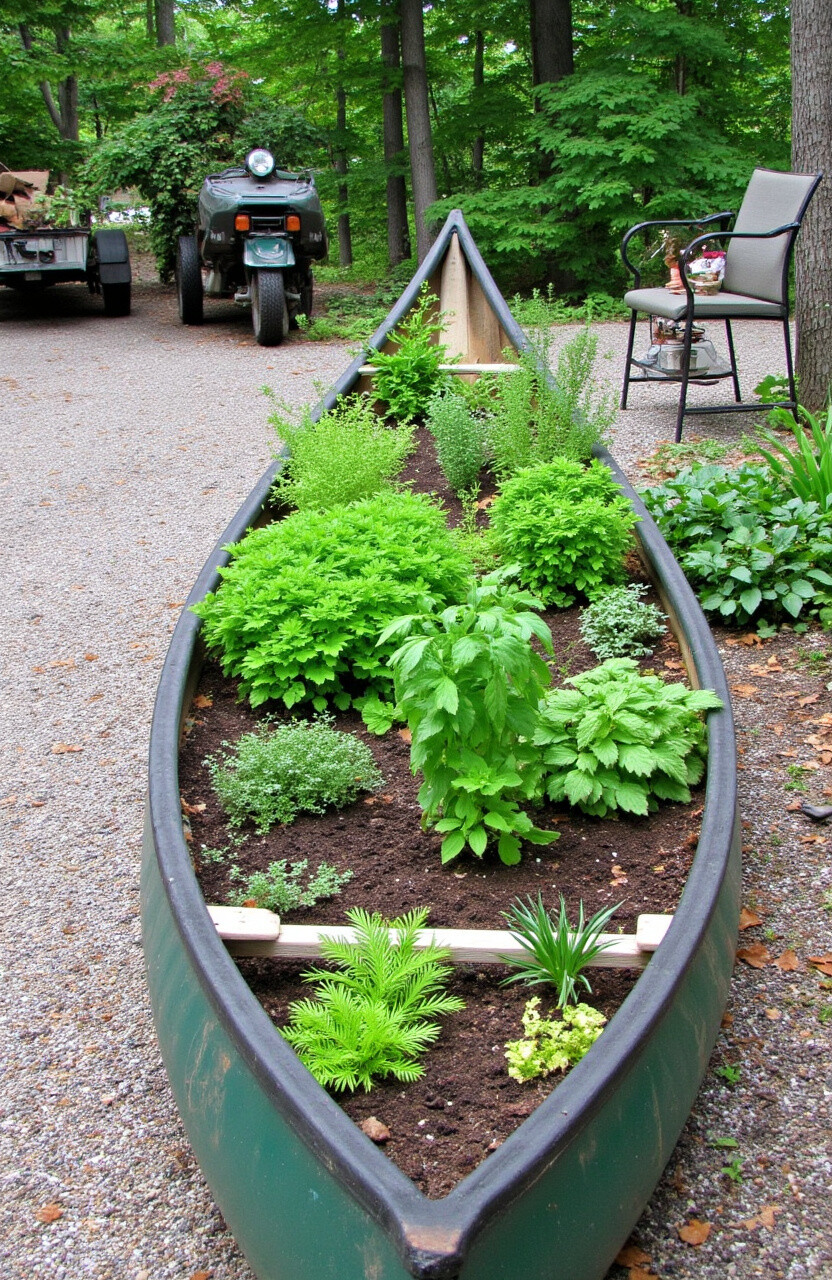 Repurpose an old canoe as a large herb planter. It’s a unique and impressive idea.