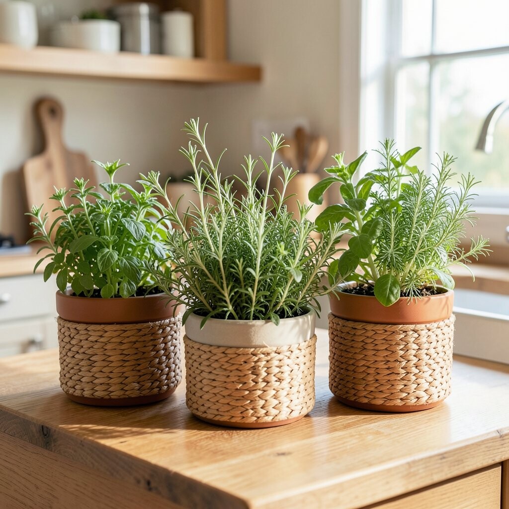 Woven sleeves around herb pots add a soft, handmade touch. They make simple planters feel warm, textured, and very inviting.