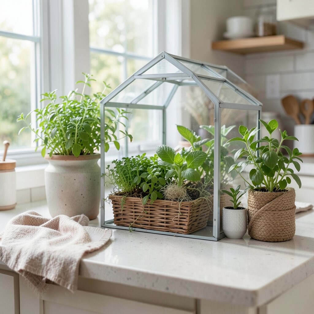 A small countertop greenhouse gives herbs a cozy little home. The clear cover makes the plants look cared for and special, almost like a tiny room for greens.