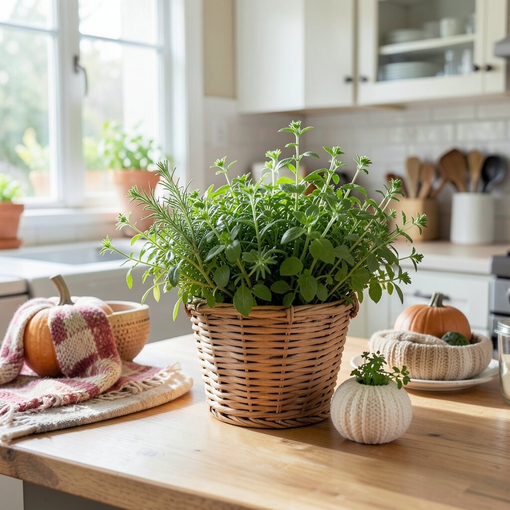 A woven basket filled with herb pots makes a lovely table or island centerpiece. It feels natural and soft, like something from a warm cottage kitchen.