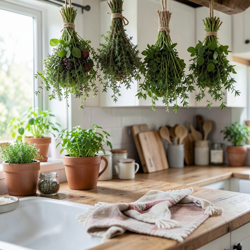 A slim rail with hanging herb pots near the sink is both pretty and practical. The plants sit close to water and light, which makes care easier.
