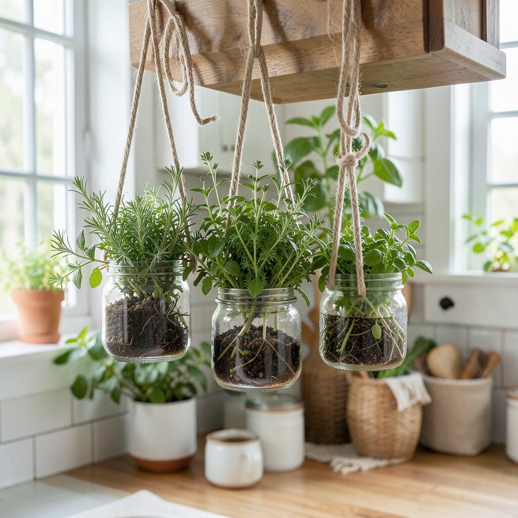 Mason jars hanging near a kitchen wall or window make a sweet country-style display. The glass catches light in a pretty way, and the herbs seem to float in the air.