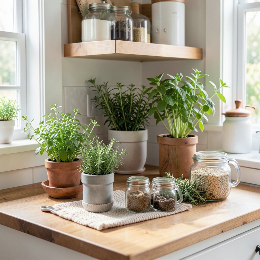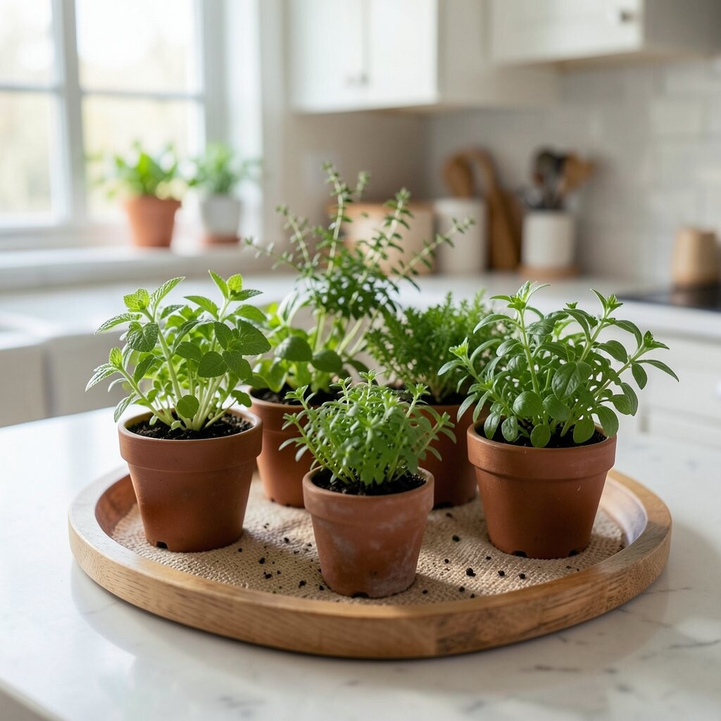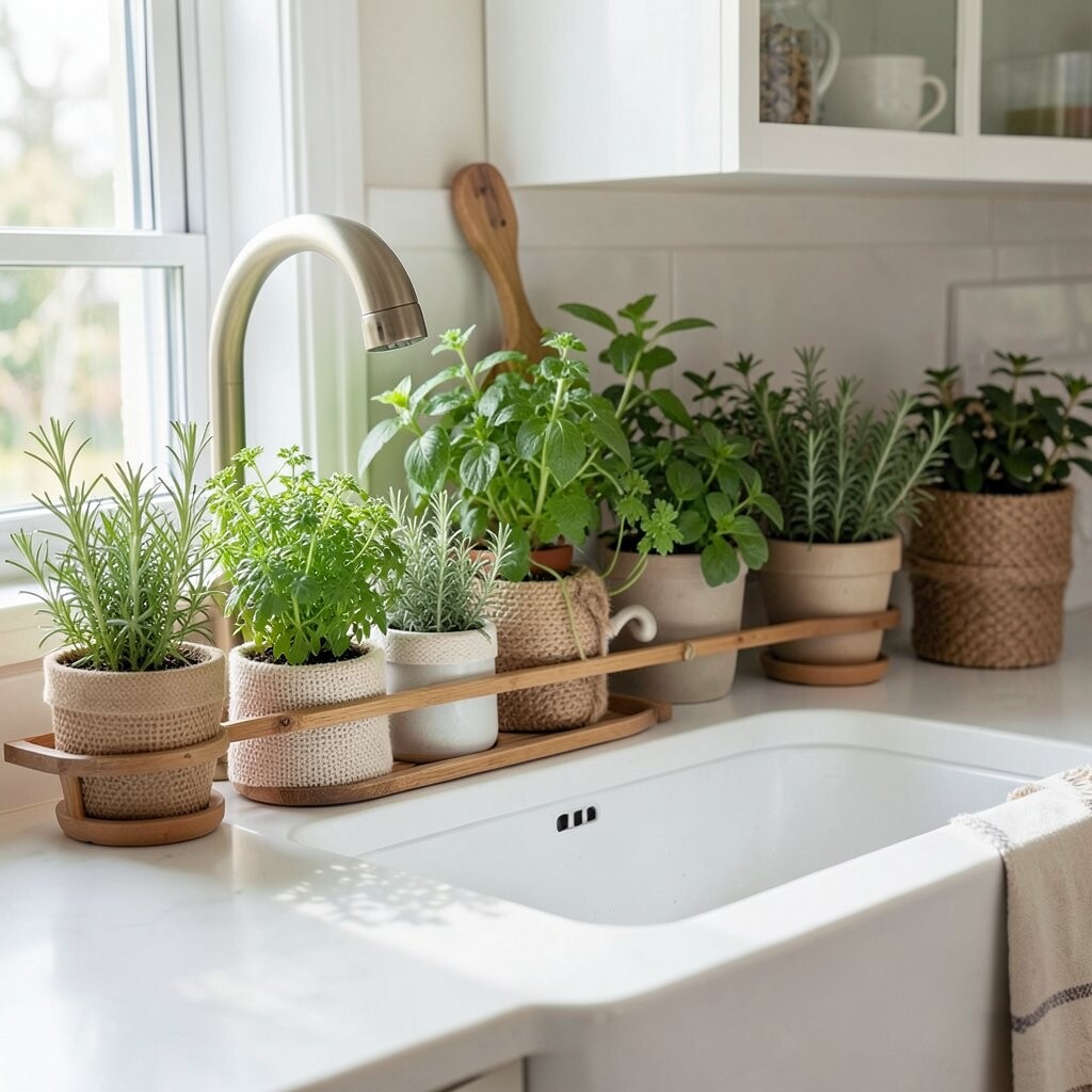 A wooden or metal tray with tiny herb pots can look tidy and stylish. It feels like a little garden sitting right on your counter.