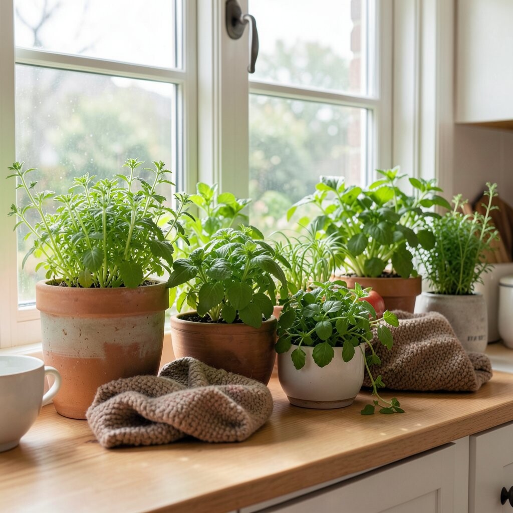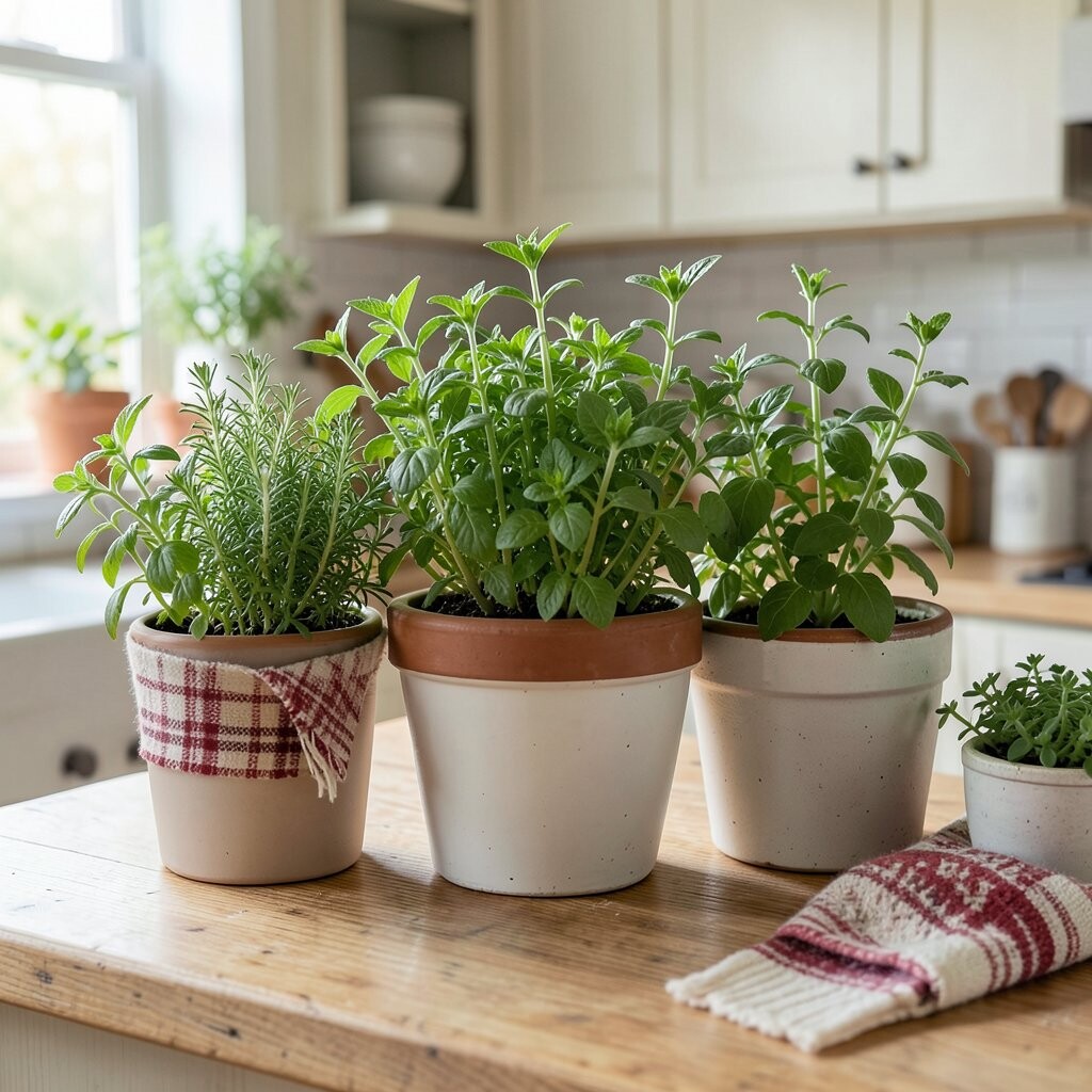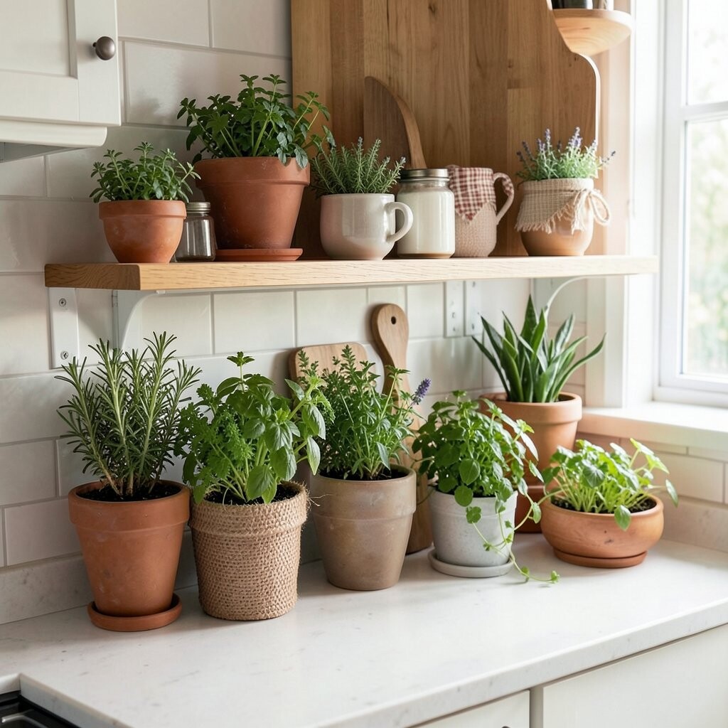A wooden or metal tray with tiny herb pots can look tidy and stylish. It feels like a little garden sitting right on your counter.