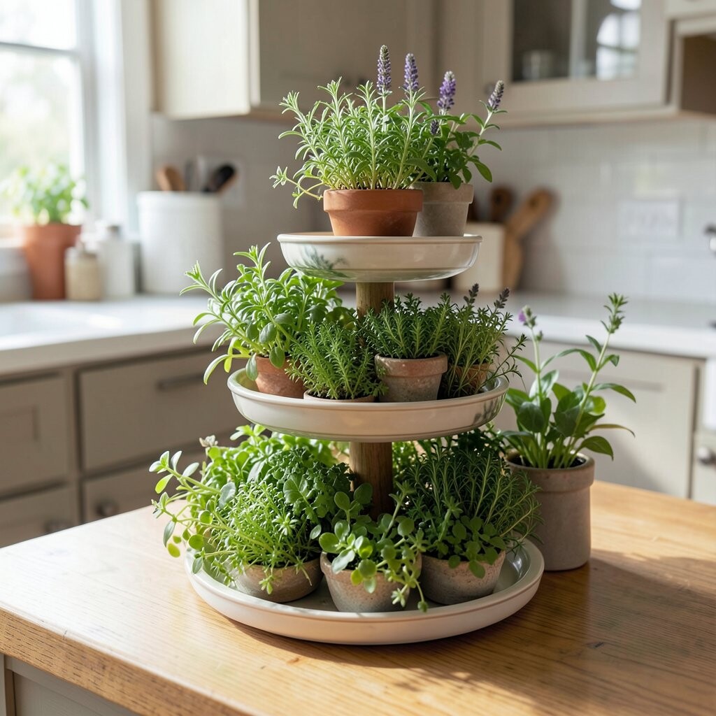 A tiered stand gives herbs a pretty step-up look, like a tiny plant stage. It works well on counters, islands, or a sunny corner table.