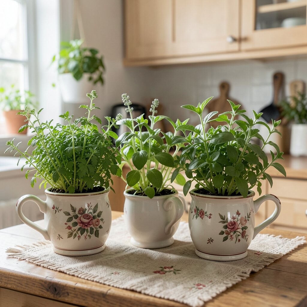 Old teacups make the cutest herb homes. They bring a soft, sweet look that feels cozy and a little bit fancy.