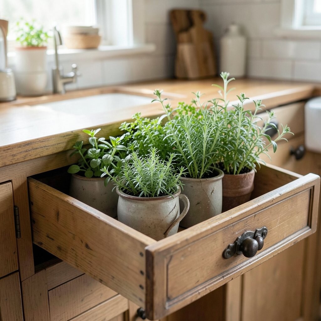 An old drawer turned into an herb display feels creative and charming. The shallow shape makes the herbs look like they are sitting in a tiny garden bed.