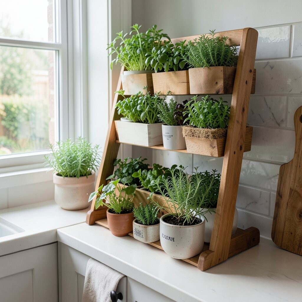 A small ladder shelf can hold herbs at different heights, making the display feel fun and full. It gives the kitchen a relaxed, lived-in look that feels very cozy.