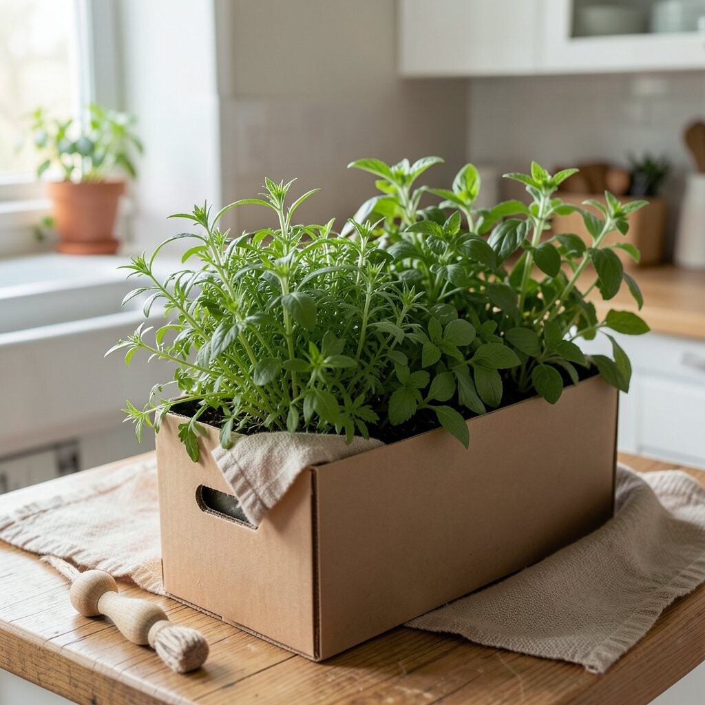 Pick herbs with different leaf shapes for a pretty mix, like thyme, oregano, and rosemary. A tray setup is low-cost and easy to change with the seasons.