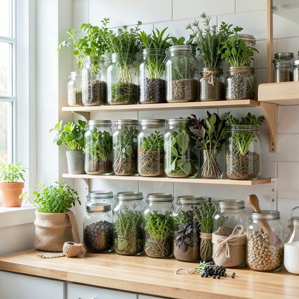 A wall of glass jars filled with herbs can look fresh and modern. The clear glass shows off roots, soil, and leaves in a beautiful way.