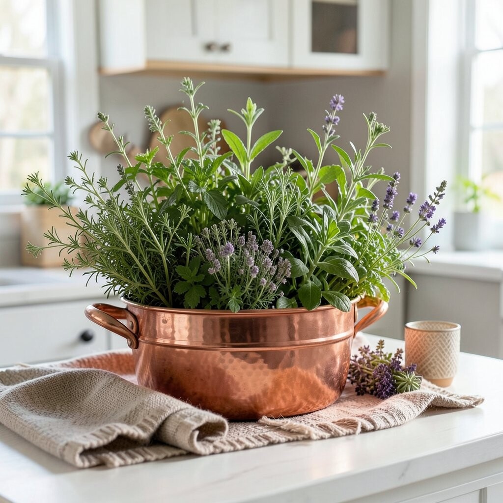 Copper pots make herbs shine with a warm, glowing look. The mix of green leaves and shiny metal feels rich and cozy at the same time.