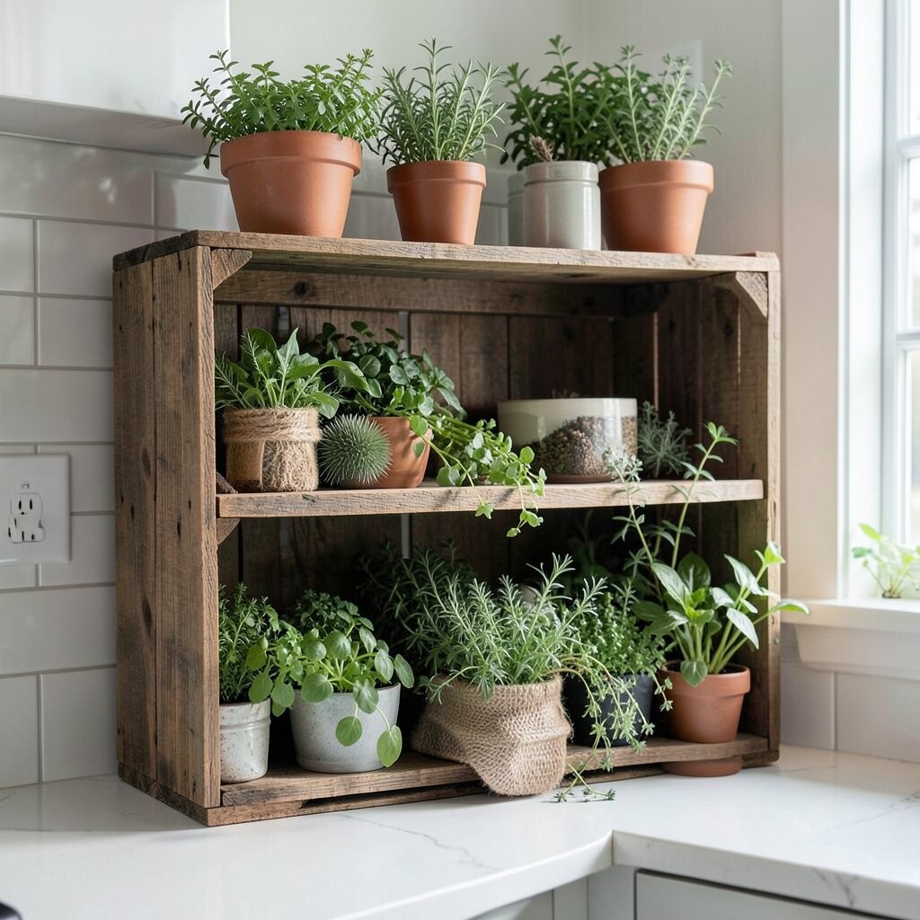 A wooden crate turned on its side can become a cozy herb shelf. It has a farmhouse feel that looks warm, relaxed, and a little old-fashioned in a good way.