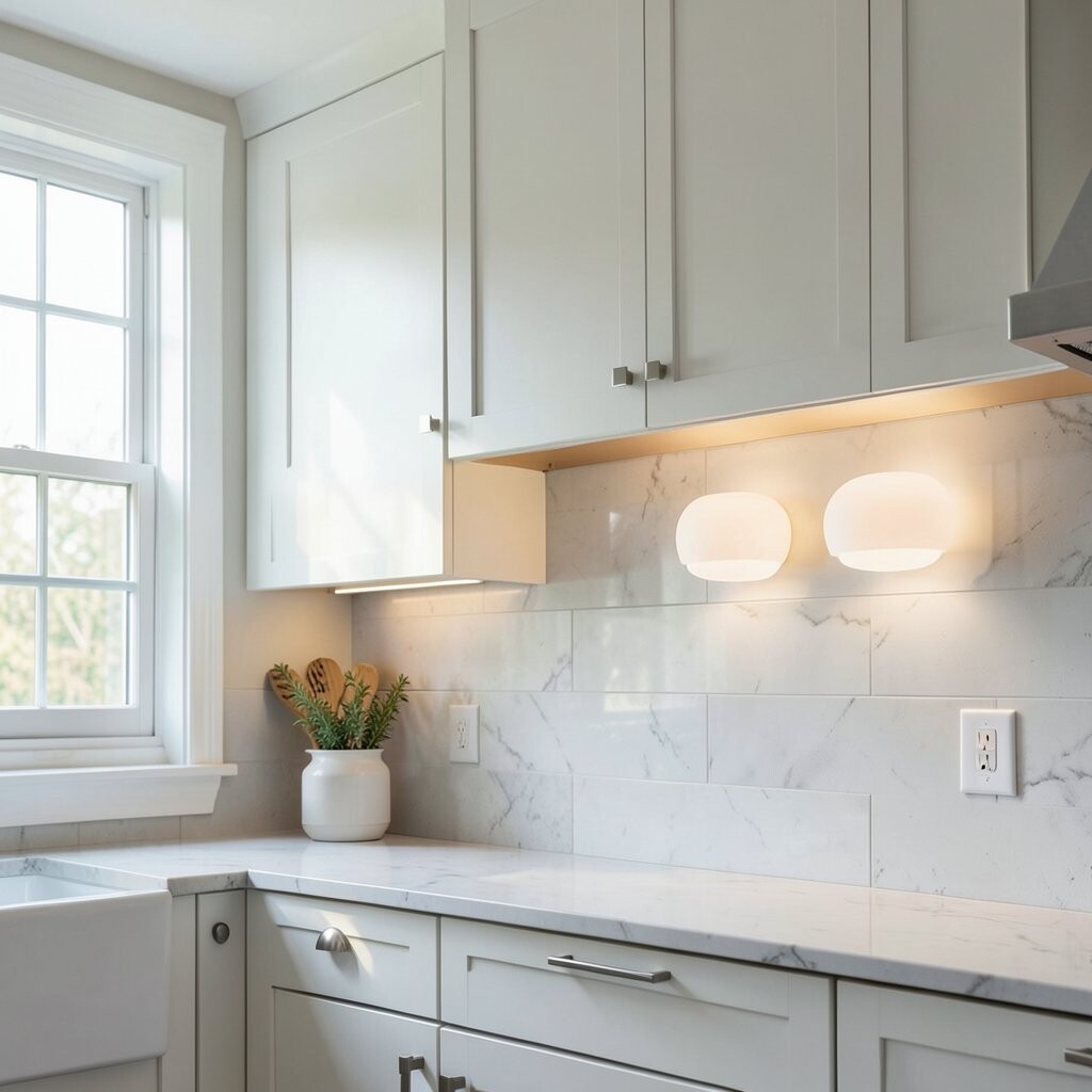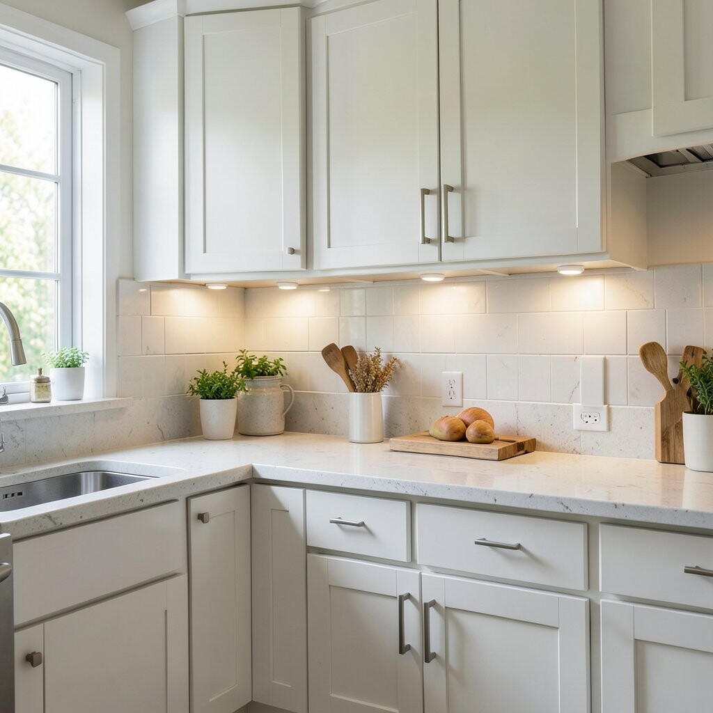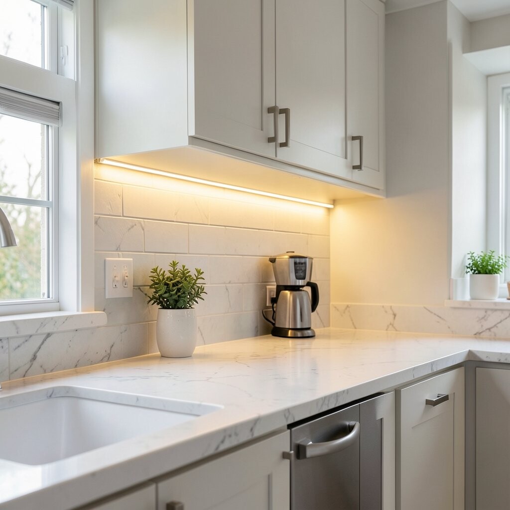 Cool white under cabinet lights give the kitchen a fresh, clean feeling. They make counters look bright and neat, which is great for busy cooking spaces.