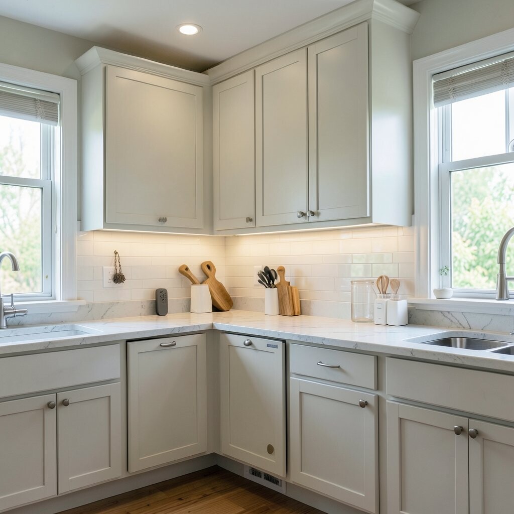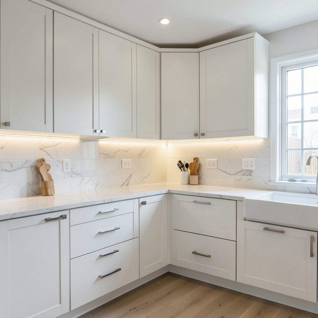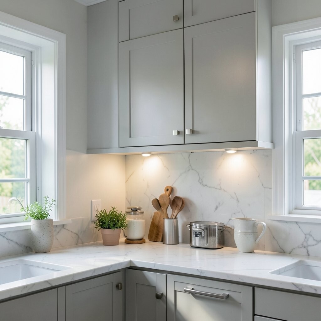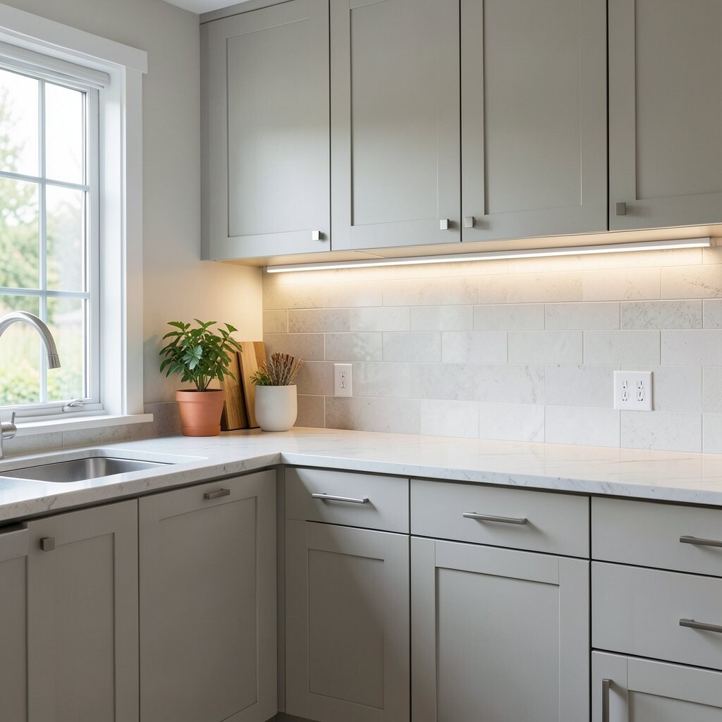 Cool white under cabinet lights give the kitchen a fresh, clean feeling. They make counters look bright and neat, which is great for busy cooking spaces.