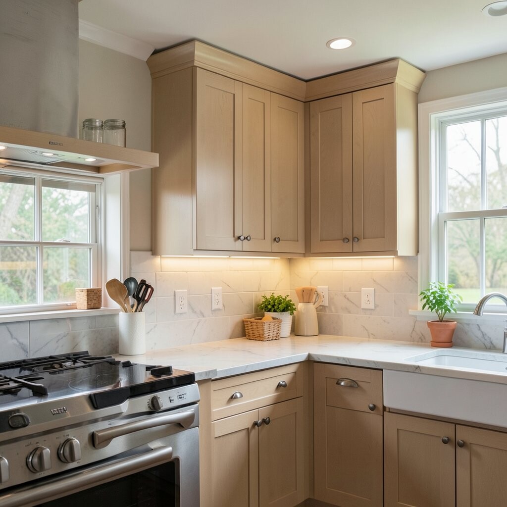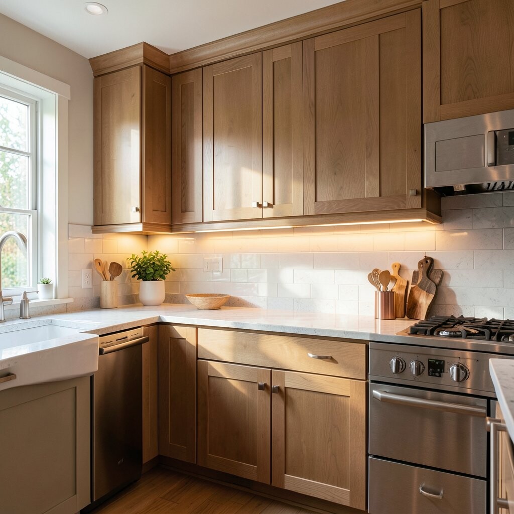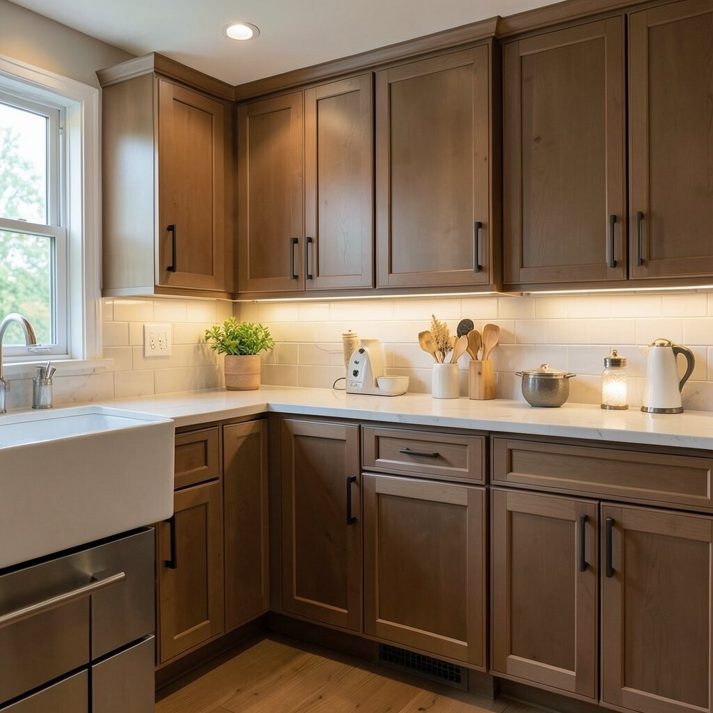This style is loved for its soft look and easy use. It helps food prep feel safer, and it makes wood cabinets look richer and more cozy.