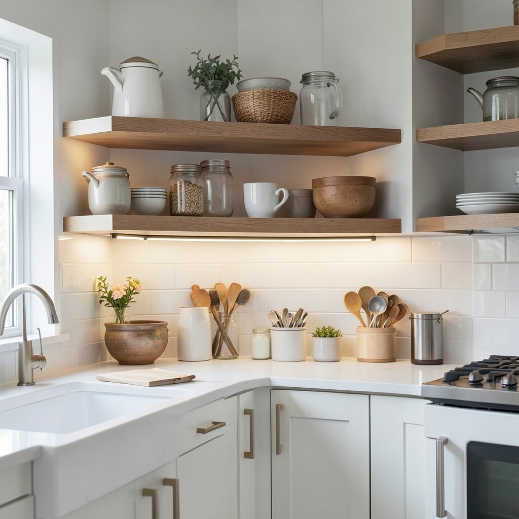 If your kitchen has open shelves, under shelf lights can make dishes and glasses look beautiful. They add a gentle glow that feels almost like a little shop display.
