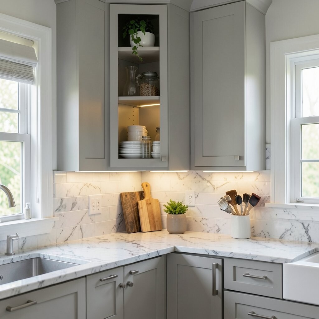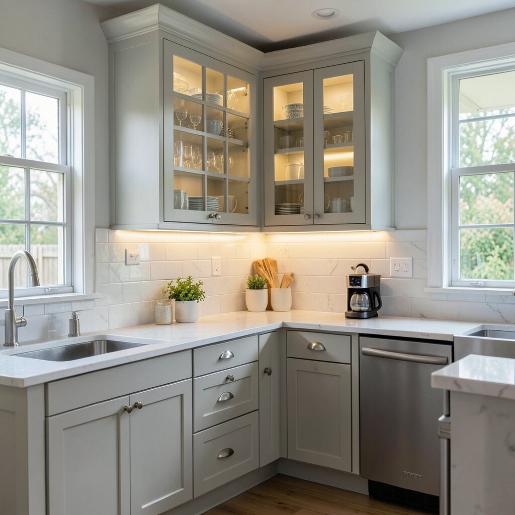 This idea is special because it blends storage and style. It helps the kitchen feel brighter and more open, even when the lights are low.
