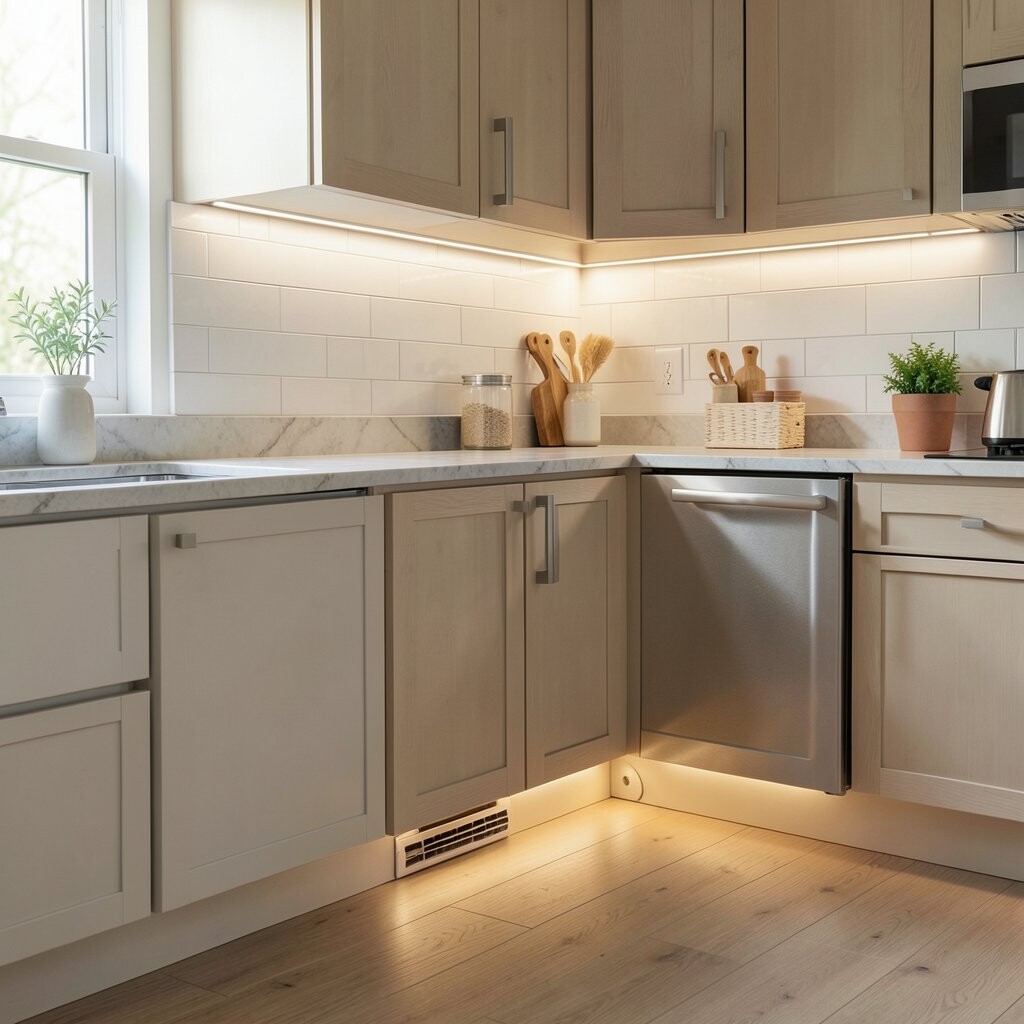 Toe kick lighting sits near the bottom of cabinets and gives the kitchen a soft floating effect. It is a cool way to add style without making the room feel crowded.