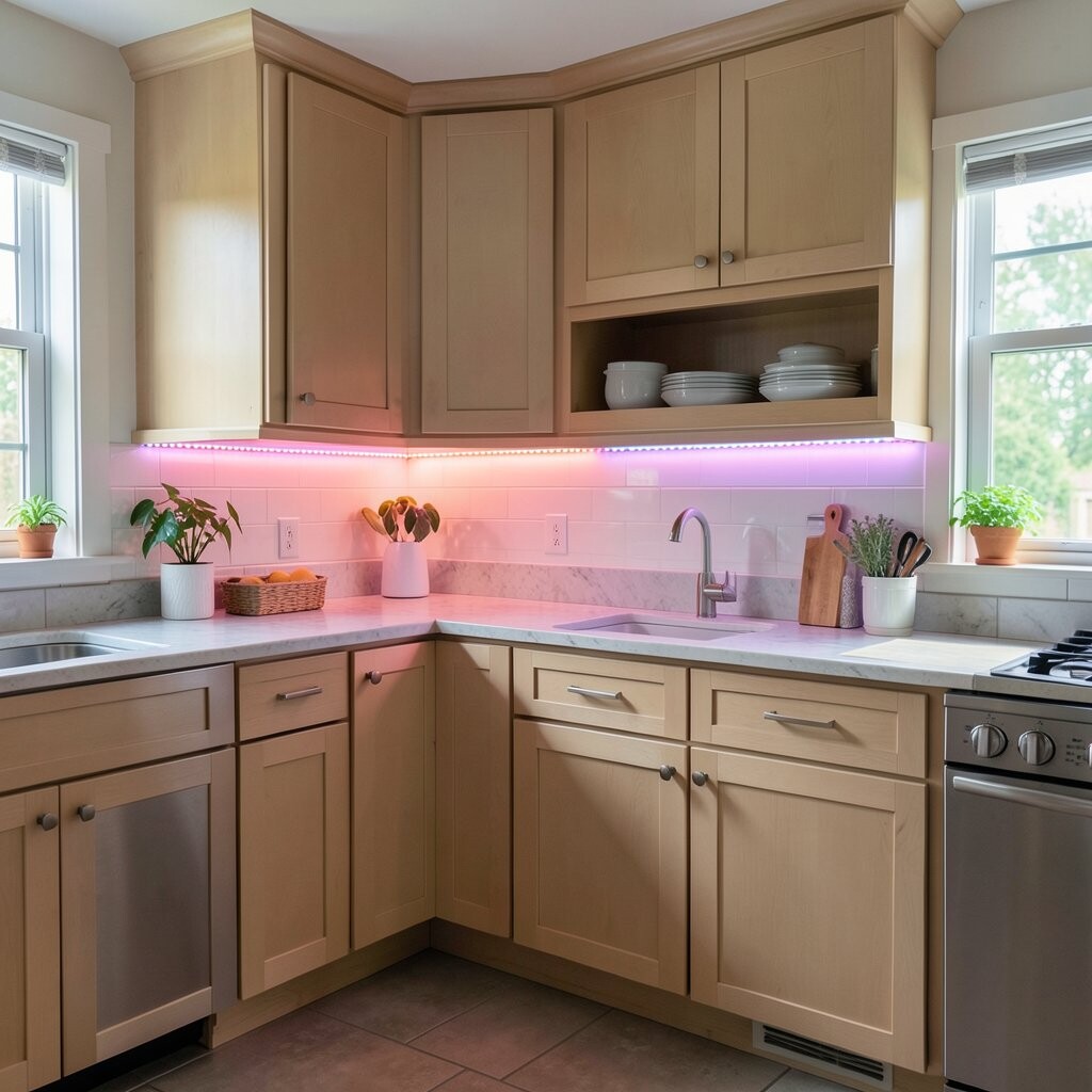 Color-changing lights bring a fun twist to the kitchen. You can pick soft white for normal use and swap to a warm color for parties or holidays.