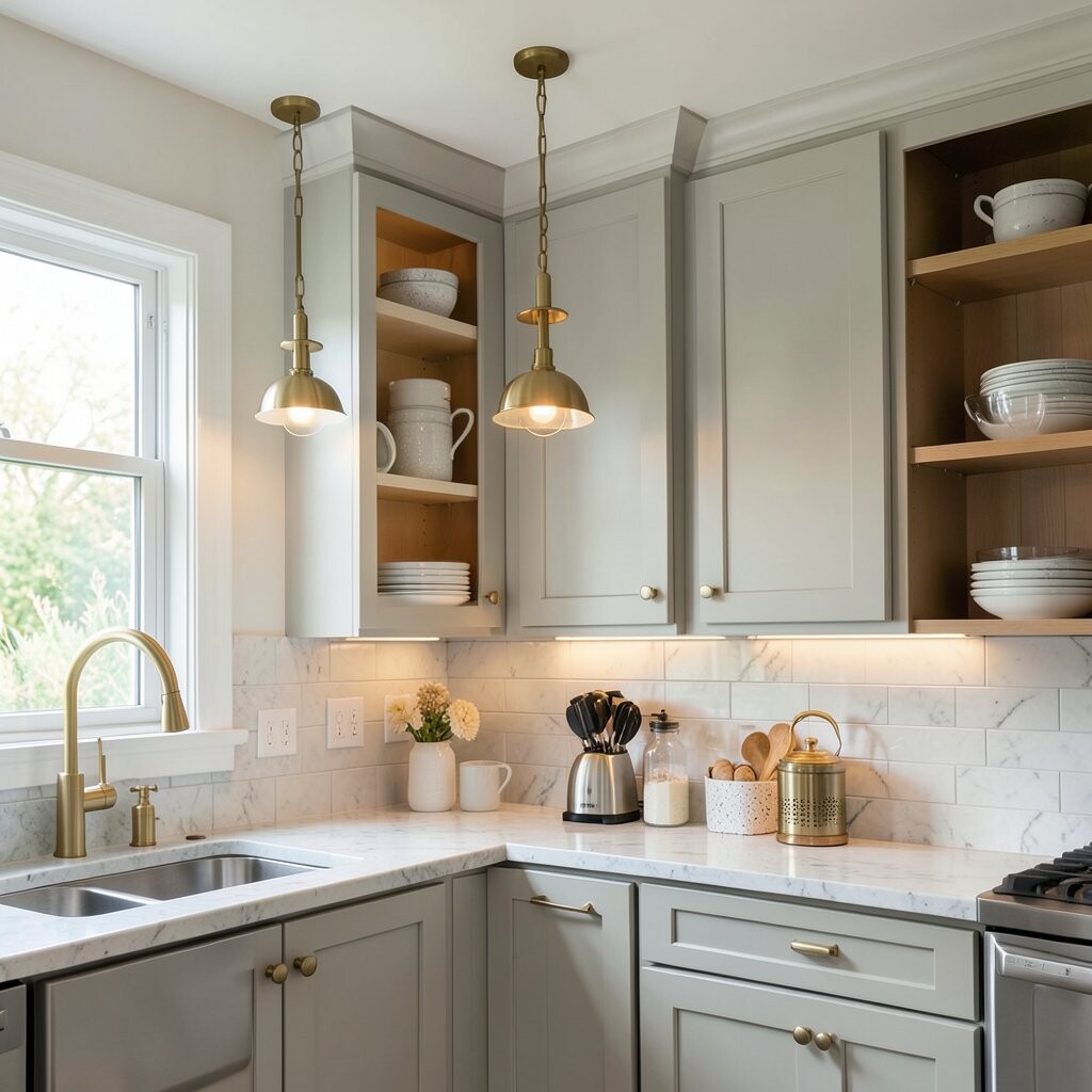 Mini pendant lights under cabinets are a bold and stylish choice. They bring a tiny bit of cafe charm into the kitchen and make the space feel very special.