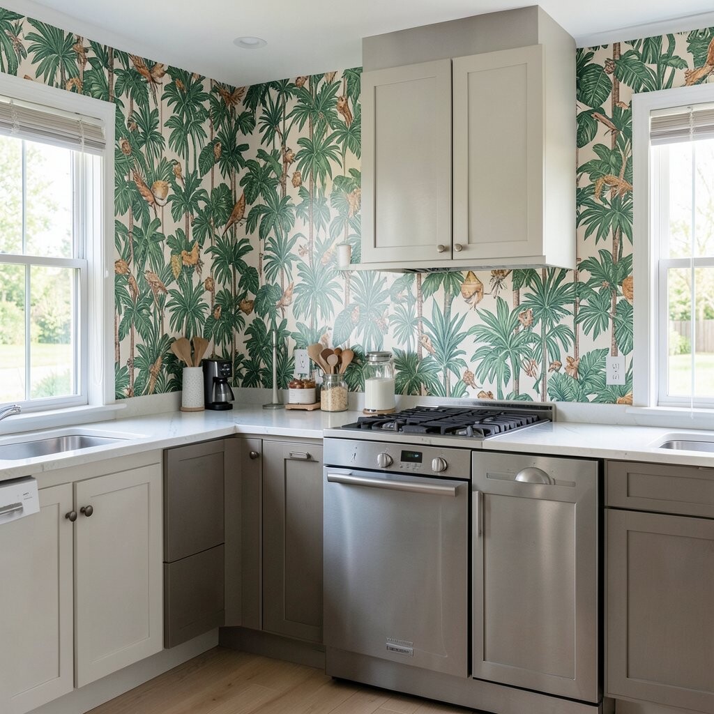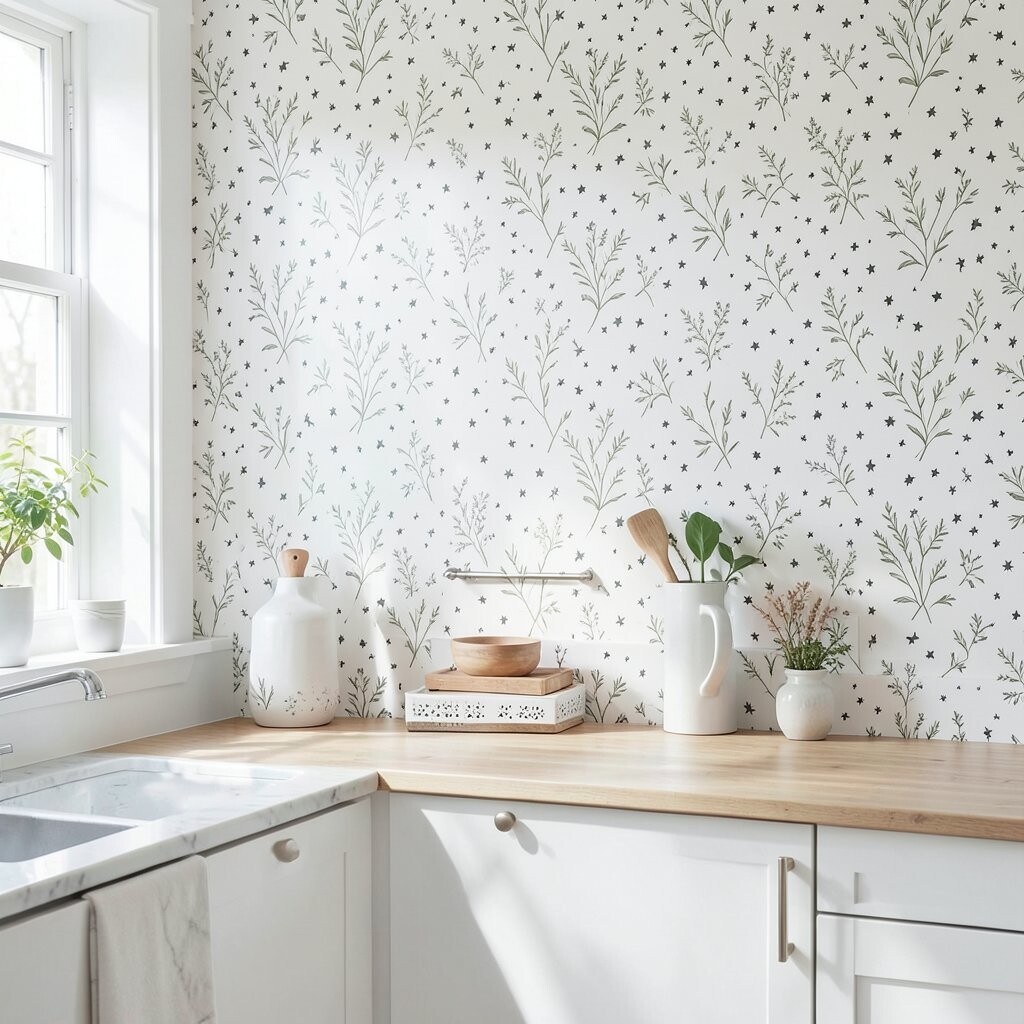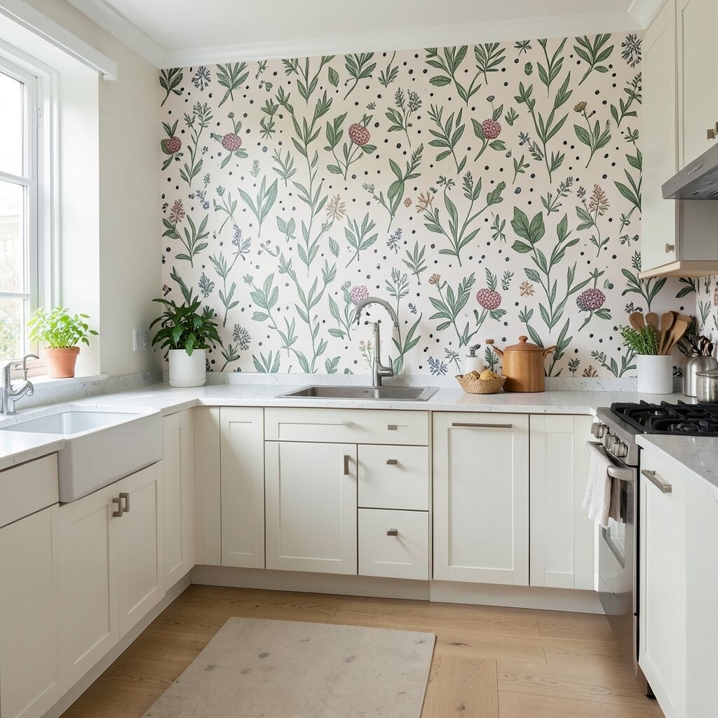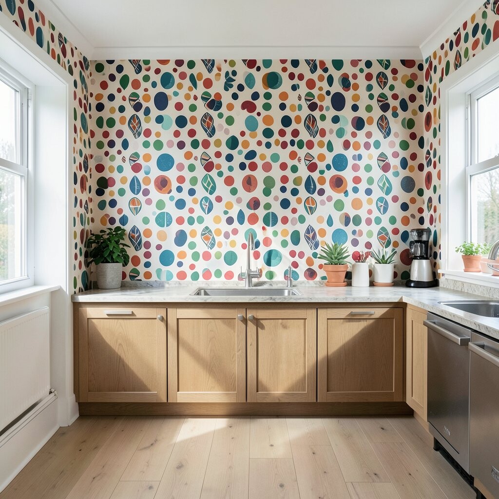 Choose dots in a soft neutral and pair them with wallpaper that has large, leafy shapes. This look is popular in modern cottage kitchens, and it can stay affordable if you use the dots on a backsplash-style panel or fabric accents.
