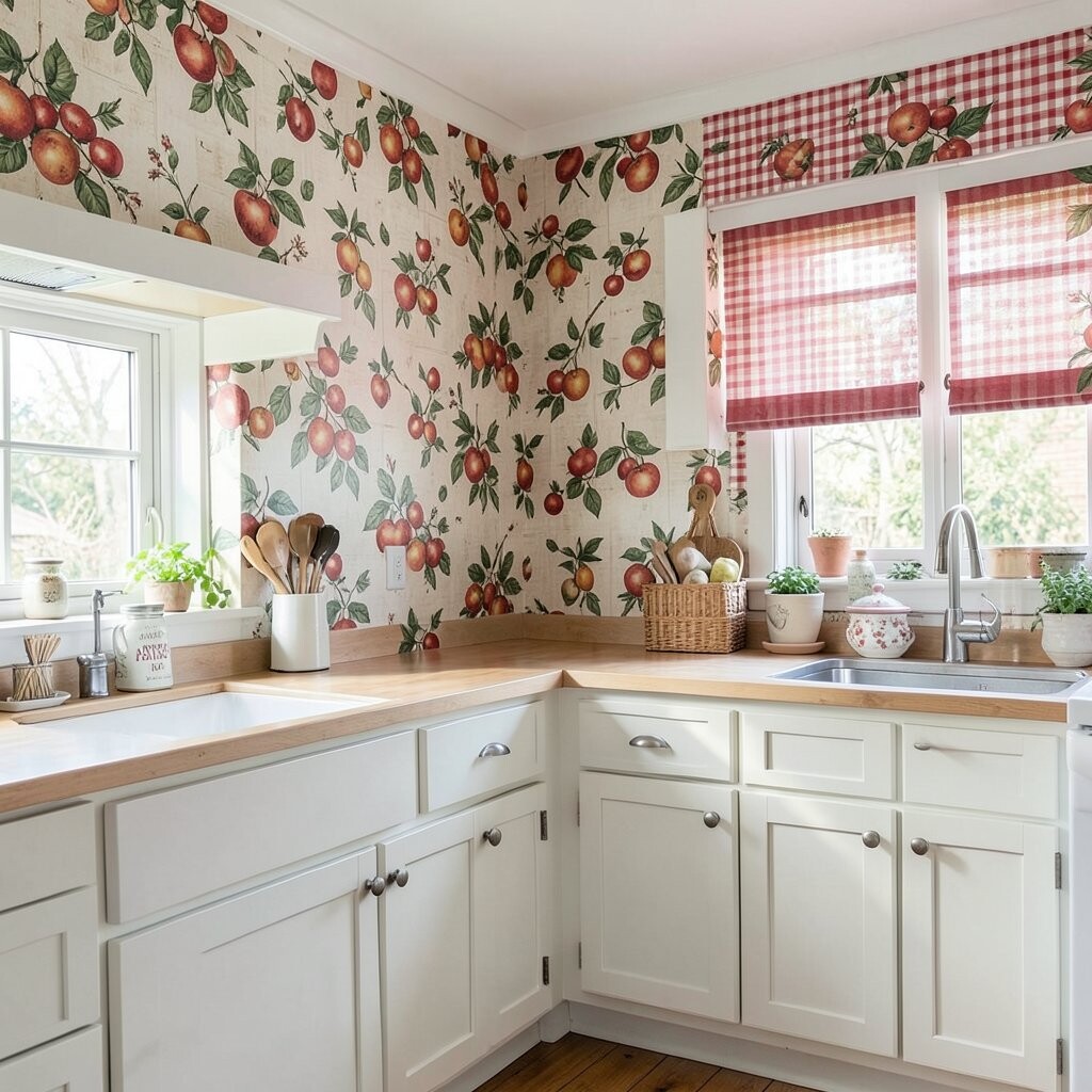 Fruit wallpaper feels bright, happy, and a little old-fashioned in the best way. Gingham adds that picnic-style charm that makes the whole room feel warm and friendly.