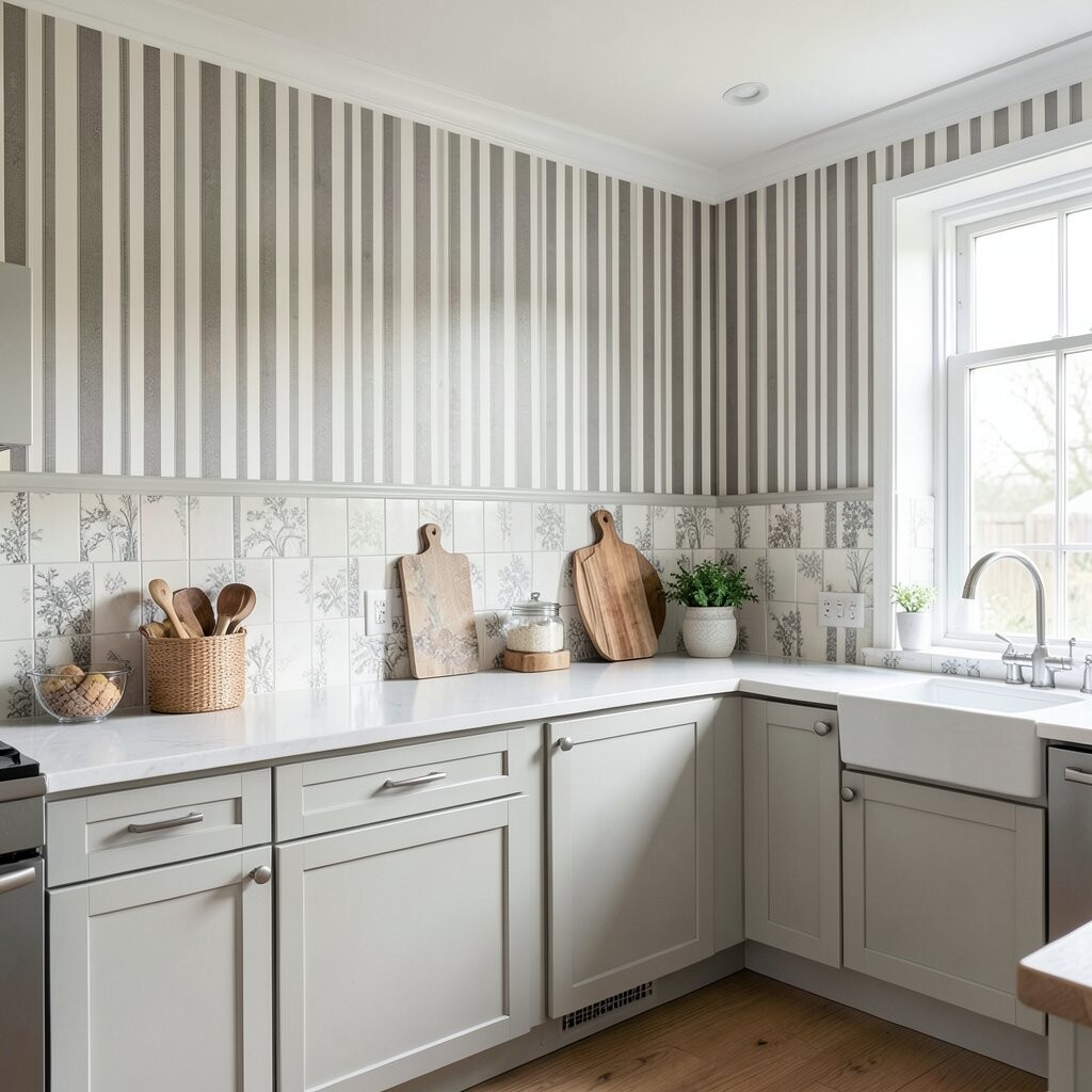 Stripes feel clean and timeless, while tile-look wallpaper adds a charming kitchen feel. Together, they can make the room seem neat and full of character.