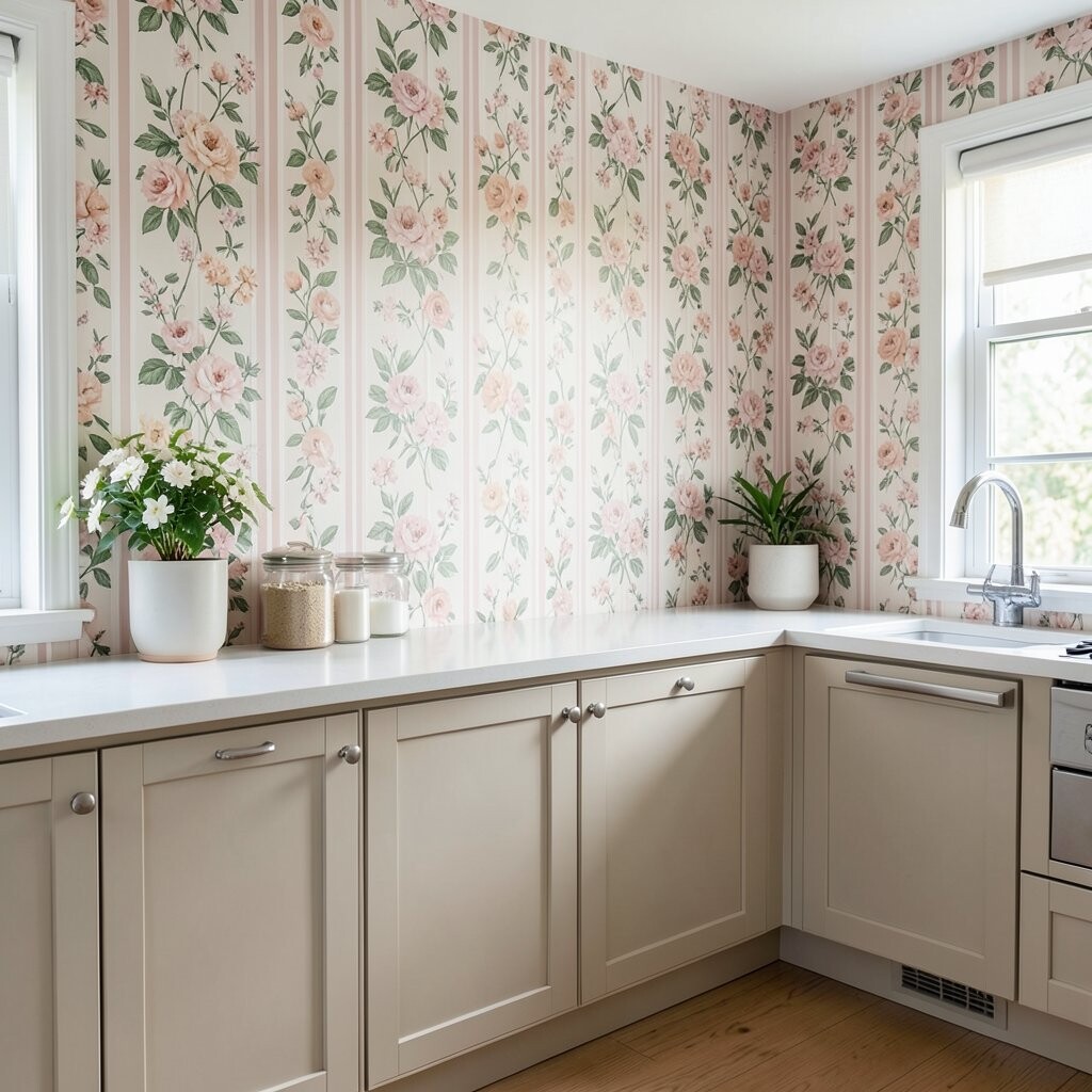 Soft floral wallpaper paired with thin stripes feels sweet and calm. The flowers bring a gentle, pretty look, while the stripes keep things neat and crisp.