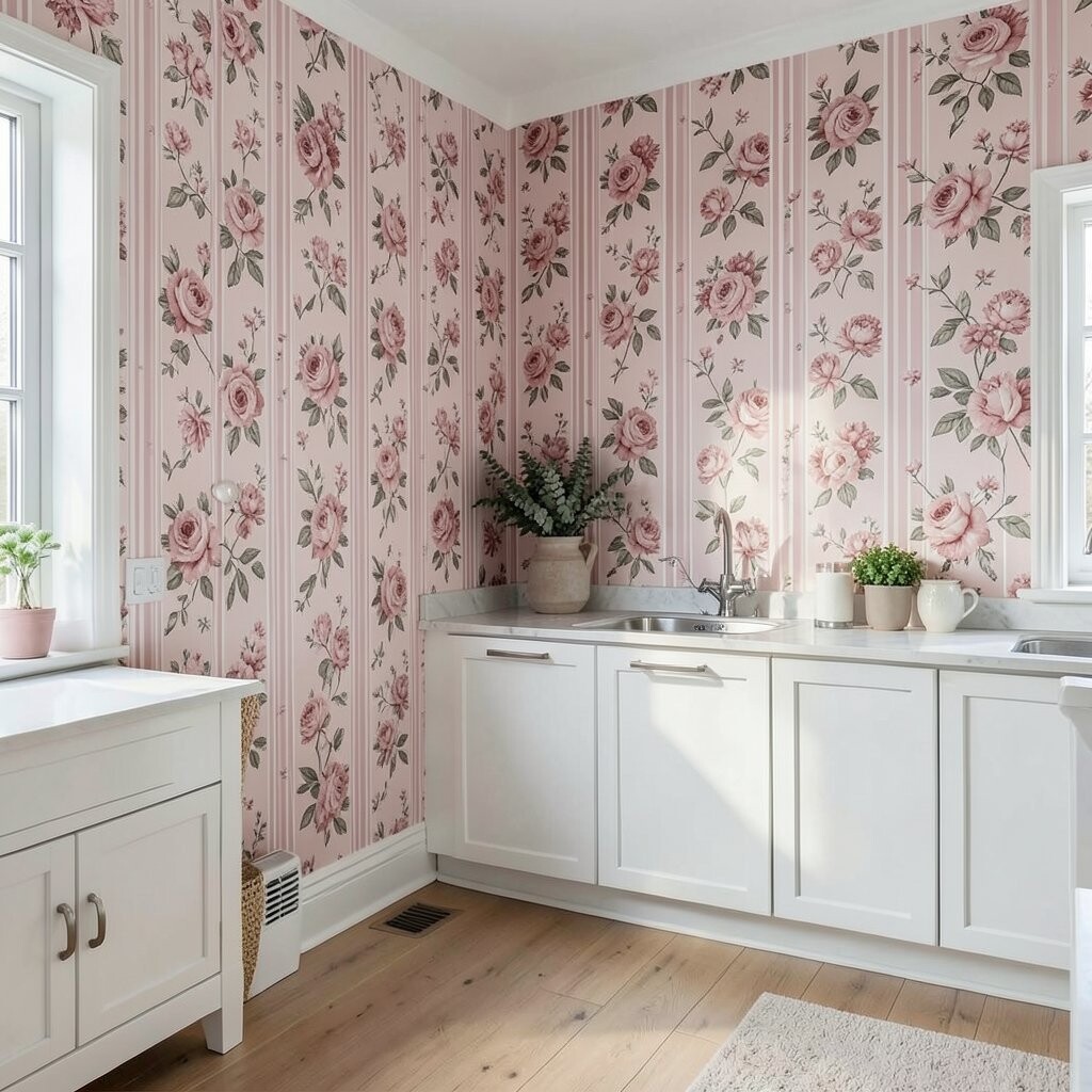 Rose wallpaper brings a soft, pretty mood that feels warm and inviting. Fine stripes add a clean line that keeps the space from getting too sweet.