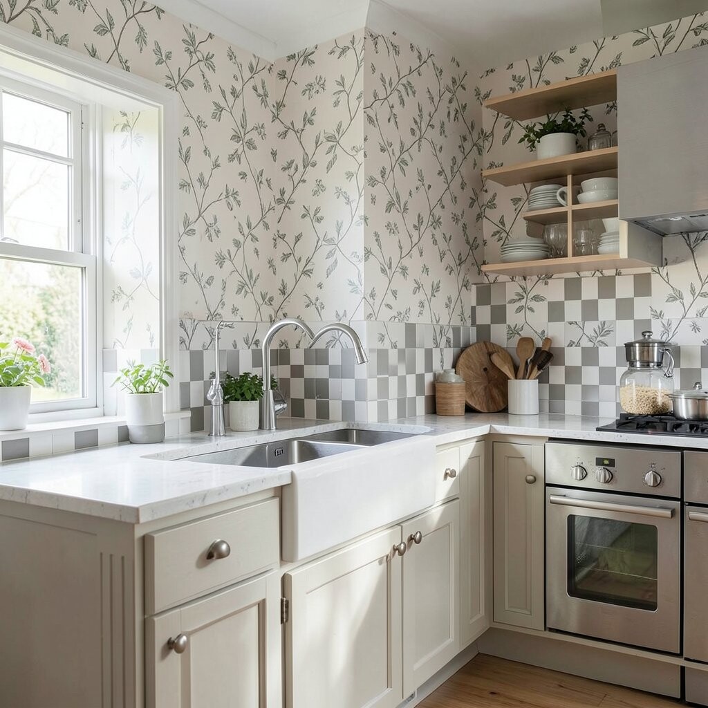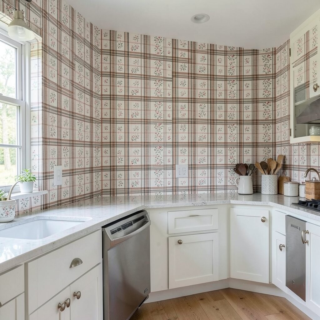 Try light blue stripes with blush flowers, or cream stripes with tiny green leaves. This look is very popular in cottage-style kitchens, and it often costs less if you use wallpaper on one wall and stripes on painted cabinets or a runner.