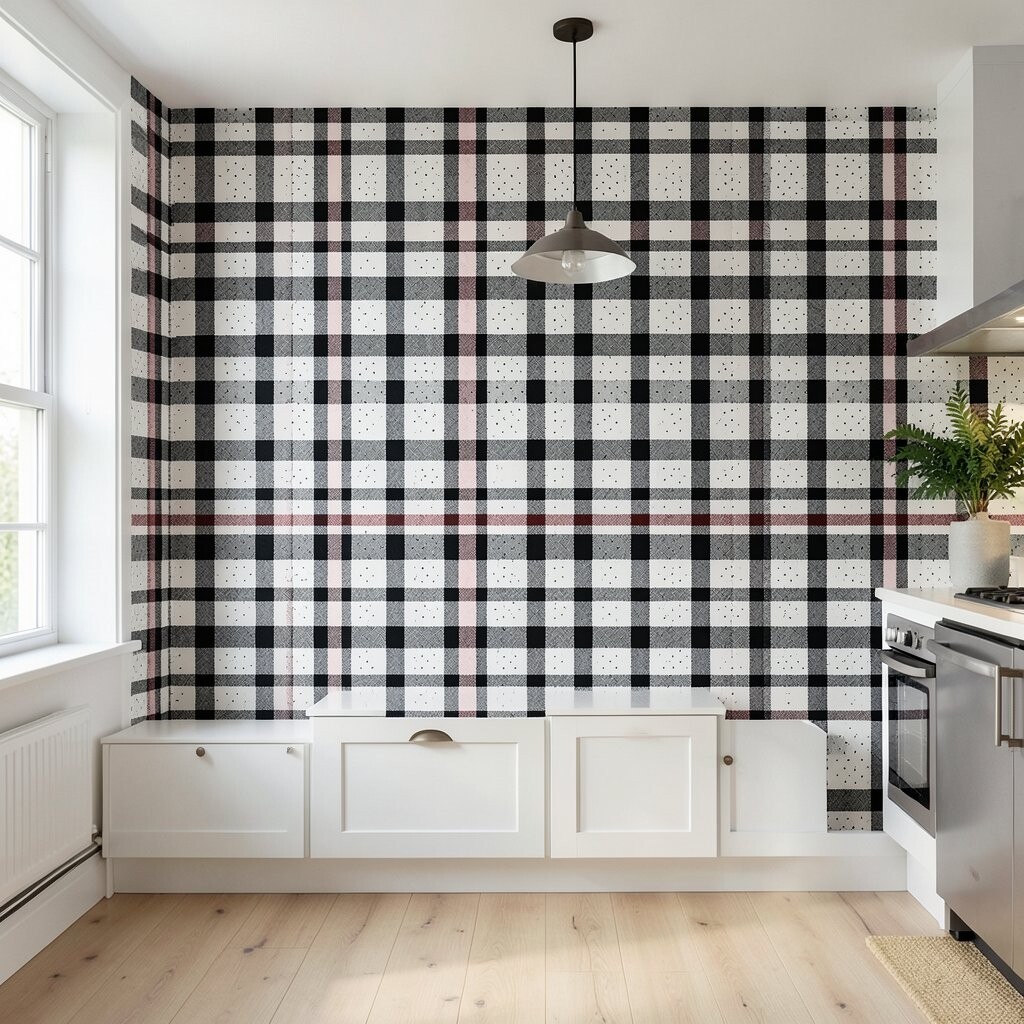 Choose one strong color from the abstract print and repeat it in the checks for a tidy look. A smart cost tip is to use the bold wallpaper on a small wall and keep the checks in simple cloth items.