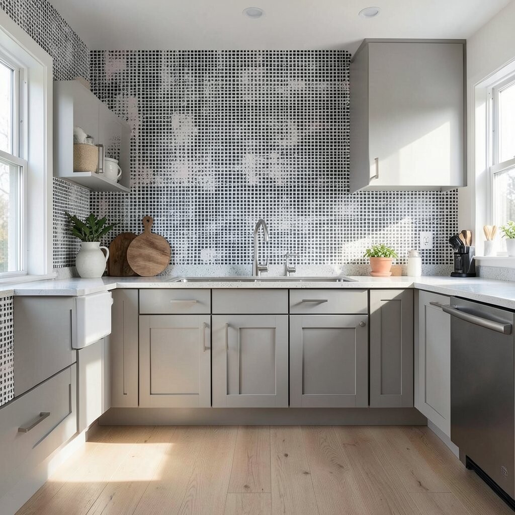 This idea is perfect if you want a kitchen that feels lively but not crowded. The small dots help the big leaves or flowers feel even more special.