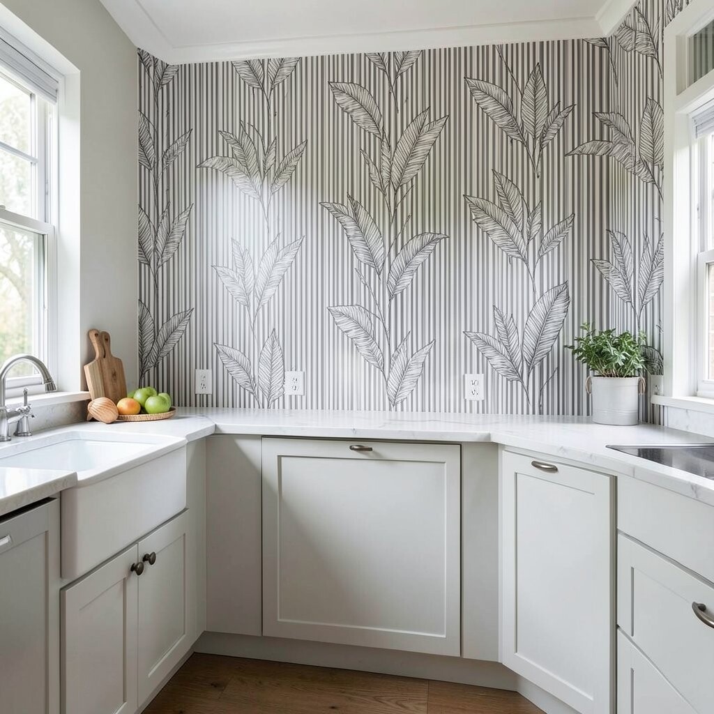 Thin pinstripes can make a kitchen feel tall and clean. Large leaf prints add a bold, natural look that brings in the feeling of a garden.