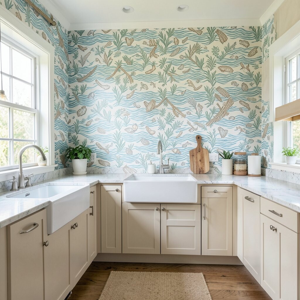 Coastal wallpaper gives a breezy, fresh feeling that reminds people of the sea. Rope or wave prints add a playful nod to the shore and keep the theme clear.