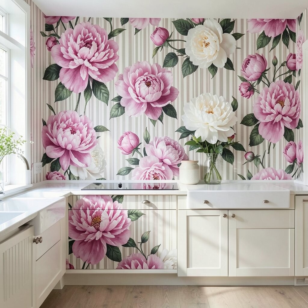 Use peonies in pink, cream, or coral with very slim stripes in a matching tone. A personal touch could be fresh flowers on the counter, which makes the wallpaper feel even more alive.
