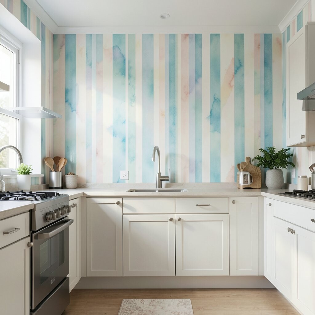 Pick watercolor blues, greens, or peach tones with very pale stripes. A nice trend right now is using this style in small kitchens to make them feel airy, and it does not need a huge budget if you keep the stripe pattern on accessories.