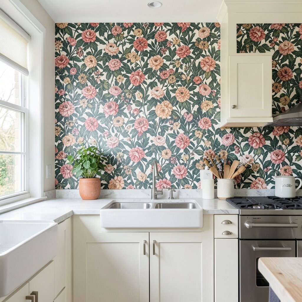 This mix is great for kitchens that need a little drama in a soft way. It can make the walls look like a fresh bouquet with a tailored edge.