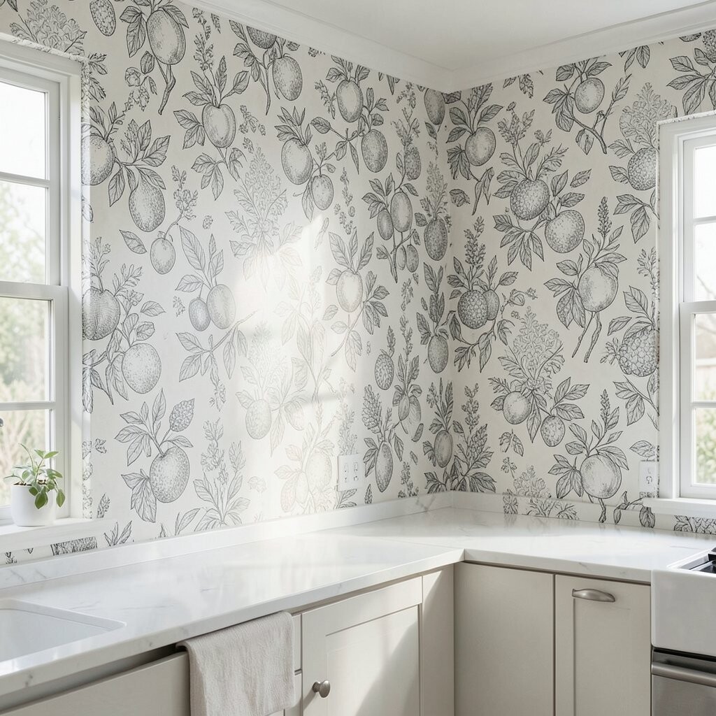 Choose a pale damask in cream or sage, then add fruit prints with apples, figs, or lemons. For a personal touch, match the fruit colors to your dishes, and use simple shelves or baskets so the wallpaper stays the star.