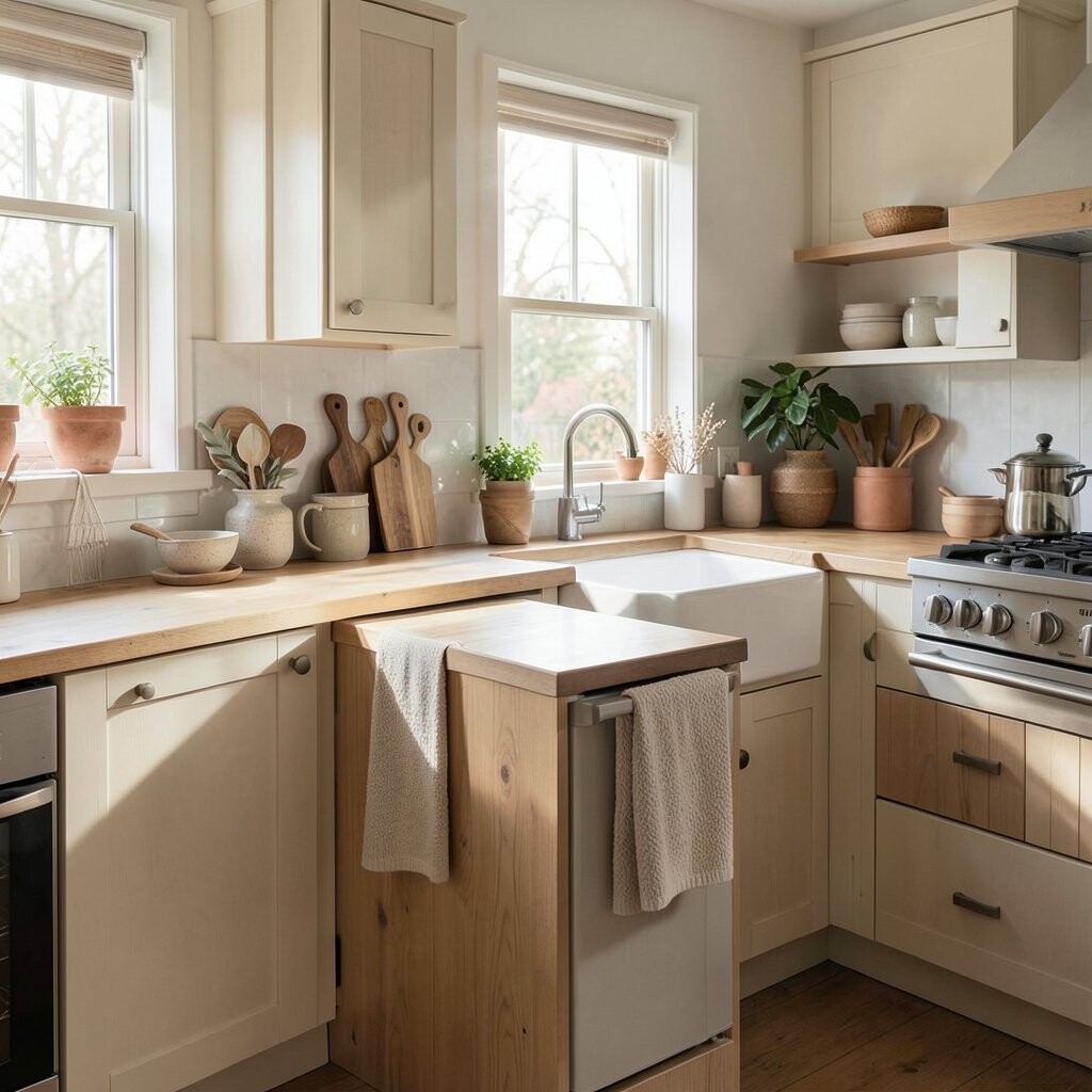 Japandi kitchens blend Japanese calm with Scandinavian warmth. You get clean shapes, natural wood, soft colors, and a very peaceful feeling.