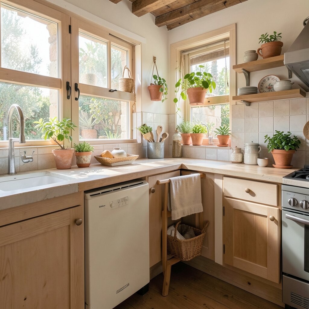 Boho kitchens feel relaxed, creative, and full of texture. Woven baskets, plants, wood, clay, and soft patterns create a cozy layered look.