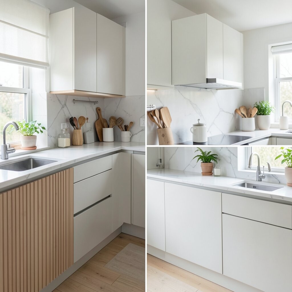 This style is great if you like a neat space that never feels busy. It makes small kitchens look bigger and helps daily cleaning feel less stressful.